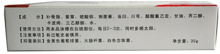 Антибактериальная мазь БайБань Tiange применяется для восстановления пигмента на пораженной витилиго кожей, для пятен, помогает вернуть нормальный тон кожи. Также мазь эффективно подавляет золотистый стафилококк, кишечную палочку и Candida albicans, снимает зуд кожи и обладает антибактериальным эффектом. Косметическое средство только для наружного применения. Не является лекарственным средством, не замещает действие лекарств.