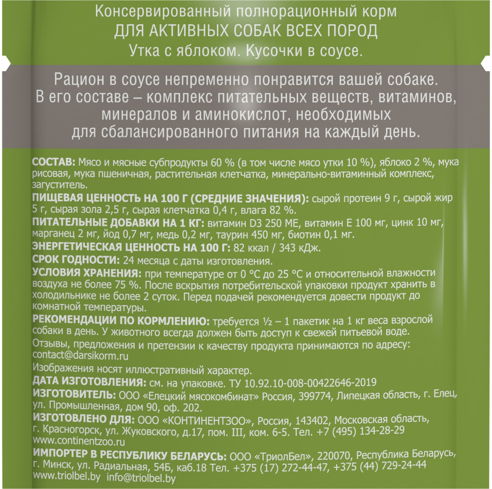 Отзывы «Корм для активных собак всех пород «Утка с яблоком. Кусочки в соусе»»
