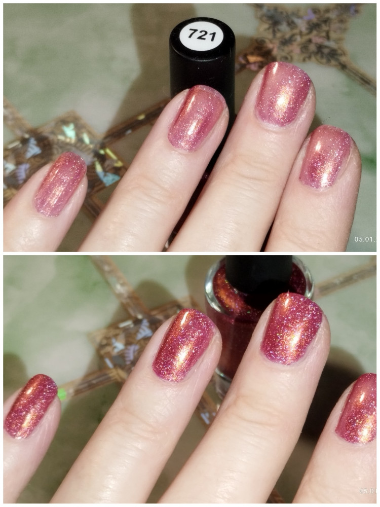 Оттенок красивый, не яркий, с мелкими голографическими блёстками, которые при ярком свете переливаются. Срок годности хороший.