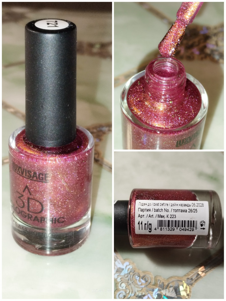 Серебристый цвет лака с мелкими блестками, хорошо ложится на ногти, быстро высыхает. Явно не галография. Срок годности хороший. Куплен со скидкой.