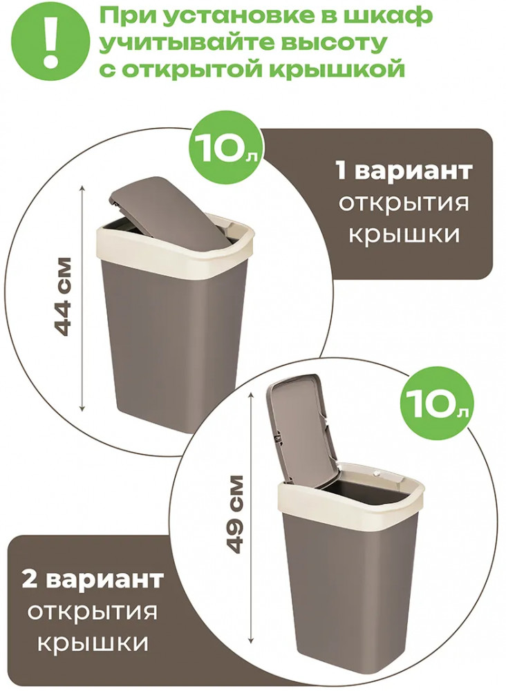 • ведро с подвижной крышкой 19×23×33 см на 10 литров (размер дна 18,6×15 см) — 1 шт.;