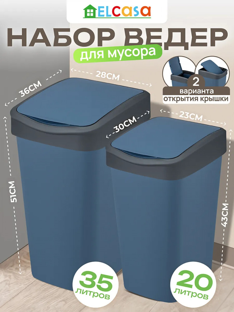 Набор 2 вёдер для мусора от бренда El Casa с подвижными крышками поможет поддерживать чистоту в вашем доме, офисе или на улице. Каждое мусорное ведро прямоугольной формы выполнено из полипропилена. Этот вид пластика считается наиболее безопасным, так как не содержит бисфенол А и не выделяет вредных веществ. Дизайн представляет собой стильное сочетание белого и серого цветов.