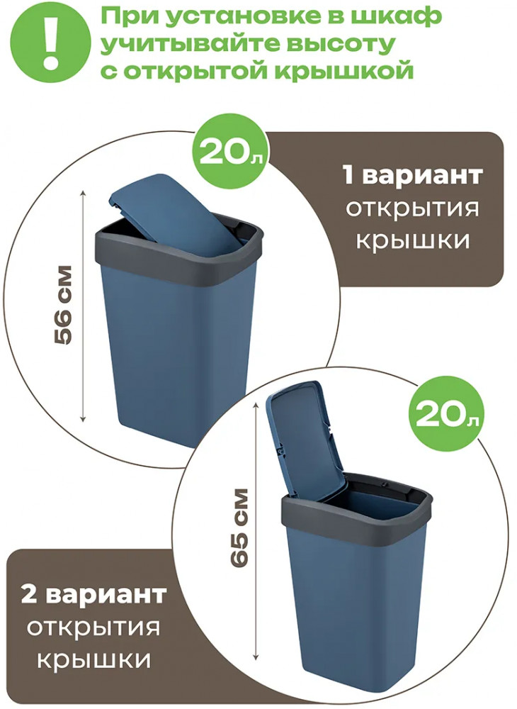 • ведро с подвижной крышкой 30×23×43 см на 20 литров (размер без крышки 28,5×22,5×38 см, размер дна 23,6×18,2 см) — 1 шт.;