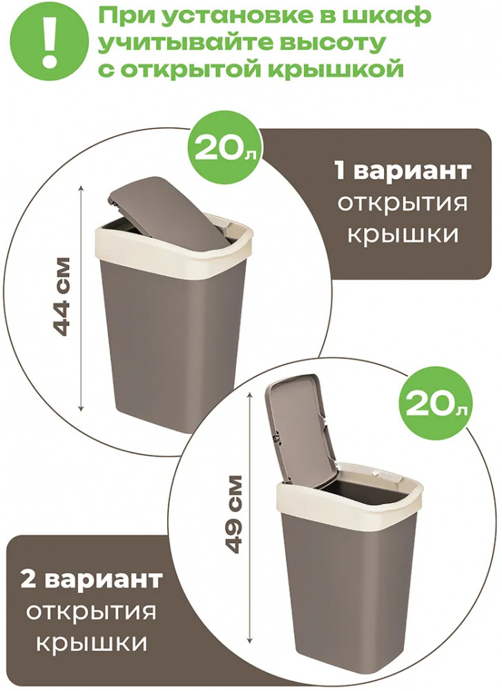 • ведро с подвижной крышкой 30×23×43 см на 20 литров (размер без крышки 28,5×22,5×38 см, размер дна 23,6×18,2 см) — 1 шт.;