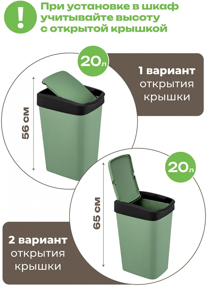 Размер каждого ведёрка с подвижной крышкой 30×23×43 см, объём 20 литров, размер дна 23,6×18,2 см. Размер без крышки 28,5×22,5×38 см.