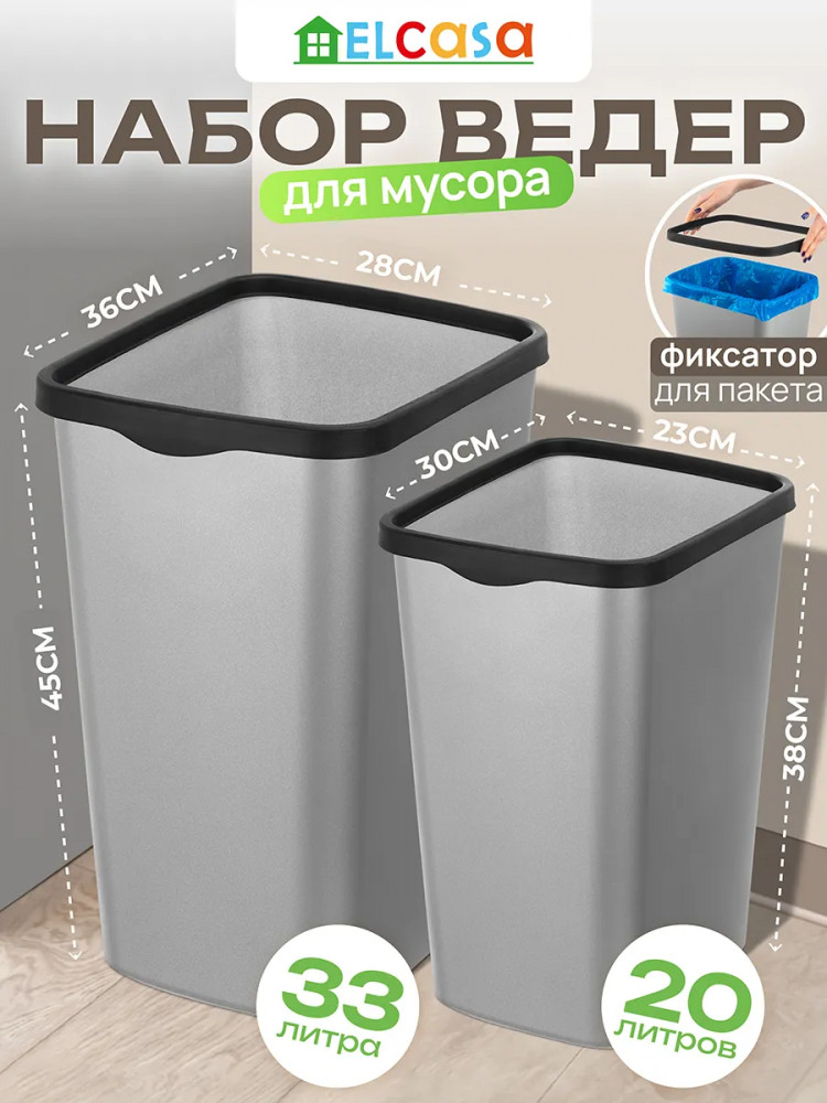 Набор 2 вёдер для мусора от бренда El Casa поможет поддерживать чистоту в вашем доме, офисе или на улице. Каждое мусорное ведро прямоугольной формы выполнено из полипропилена. Этот вид пластика считается наиболее безопасным, так как не содержит бисфенол А и не выделяет вредных веществ. Дизайн представляет собой стильное сочетание белого и серого цветов.