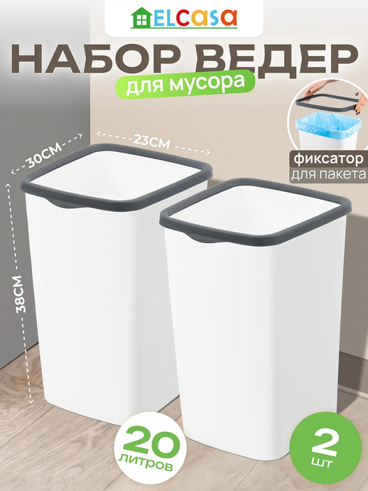 Набор 2 белых вёдер для мусора с фиксаторами от бренда El Casa поможет поддерживать чистоту в вашем доме, офисе или на улице. Каждый мусорный контейнер выполнен из полипропилена. Этот вид пластика считается наиболее безопасным, так как не содержит бисфенол А и не выделяет вредных веществ.