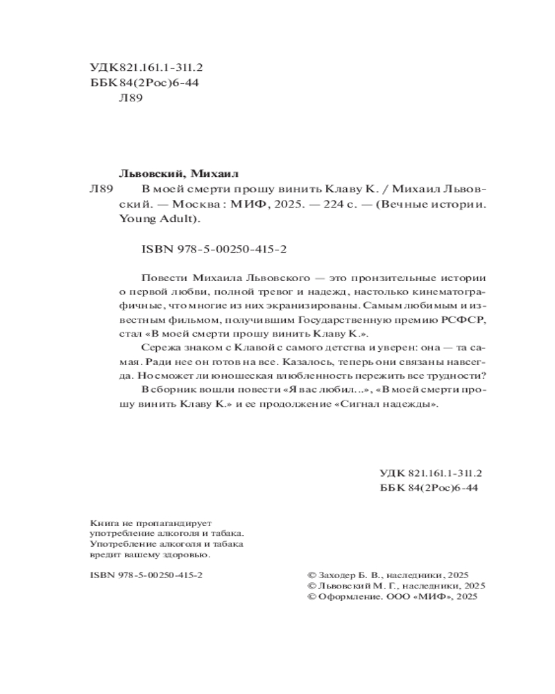 💳 Оплатить за товар можно при получении 🇰🇿 Есть бесплатная доставка по Казахстану от 1 дня 🎁 Копите бонусы с каждой покупки Серия: Вечные истории. Young Adult Повести Михаила Львовского — это пронзительные истории о первой любви, полной тревог и надежд, настолько кинематографичные, что многие из них экранизированы. Самым любимым и известным фильмом, получившим Государственную премию РСФСР, стал «В моей смерти прошу винить Клаву К.». |