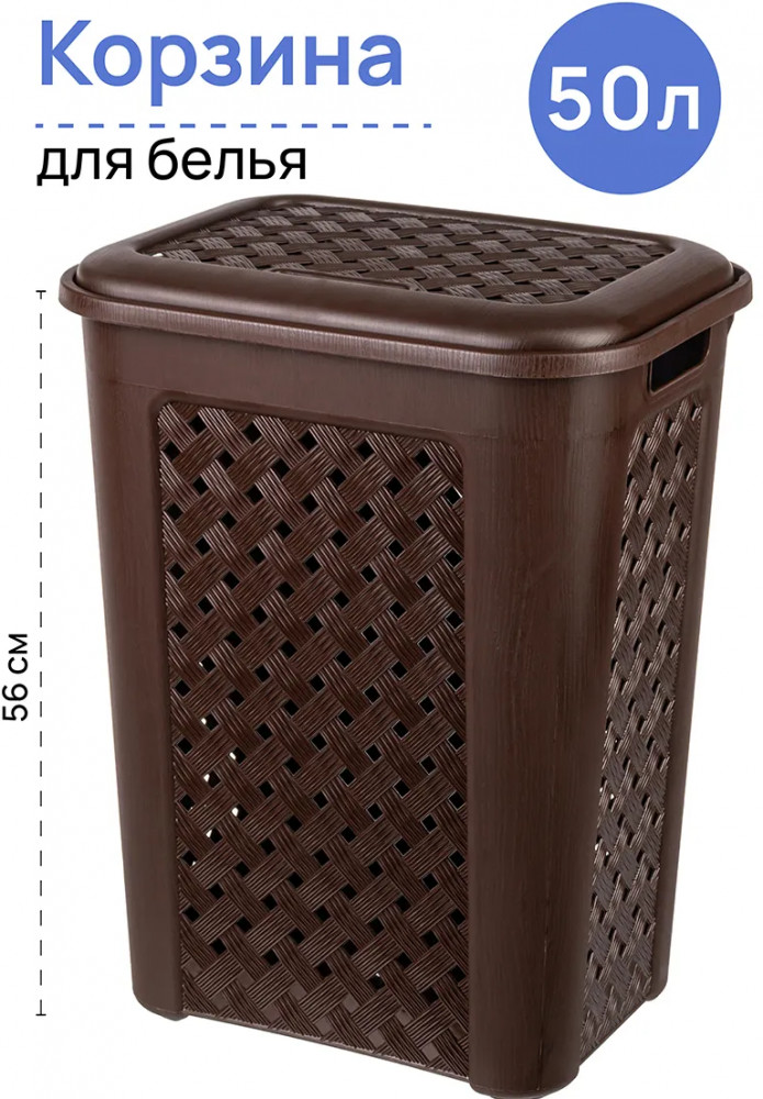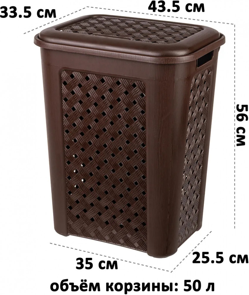 Прямоугольная корзина для белья с крышкой от El Casa предназначена для организации хранения в вашем доме. Размер изделия — 43.5×33.5×56 см, объём — 50 литров. Размер дна — 35×25,5 см. Выполнена из полипропилена — прочного пластика, который не содержит бисфенол А и другие вредные вещества. Поверхность изделия украшена вставками с плетёным рельефом, одновременно обеспечивающим дополнительную вентиляцию. Корзина оснащена удобной крышкой с ручкой-отверстием, обеспечивающей лёгкость открывания. Изделие идеально подходит для аккуратного хранения белья перед стиркой и позволяет заранее сортировать одежду, полотенца, постельное бельё, наволочки и другие текстильные изделия. Она поможет организовать практичную систему хранения ваших вещей. Разместите её рядом со стиральной машинкой, под раковиной или в шкафу.