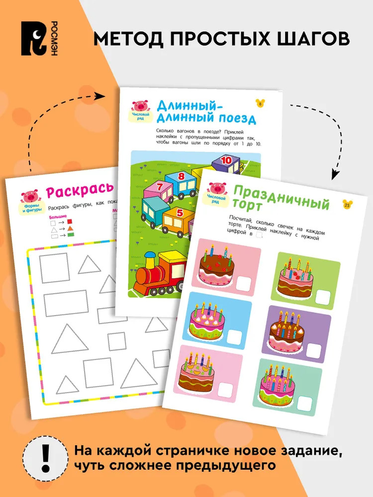 💳 Оплатить за товар можно при получении 🇰🇿 Есть бесплатная доставка по Казахстану от 1 дня 🎁 Копите бонусы с каждой покупки Серия: Весёлые развивашки «Весёлые развивашки» — это серия для детей от 2 до 6 лет с простыми и занимательными заданиями, которые научат вырезать, рисовать, проходить лабиринты, считать и решать задачки на логику. Книга для четырёх лет научит считать до 10 и по порядку, расставлять предметы от большого к маленькому, объединять предметы по группам. |