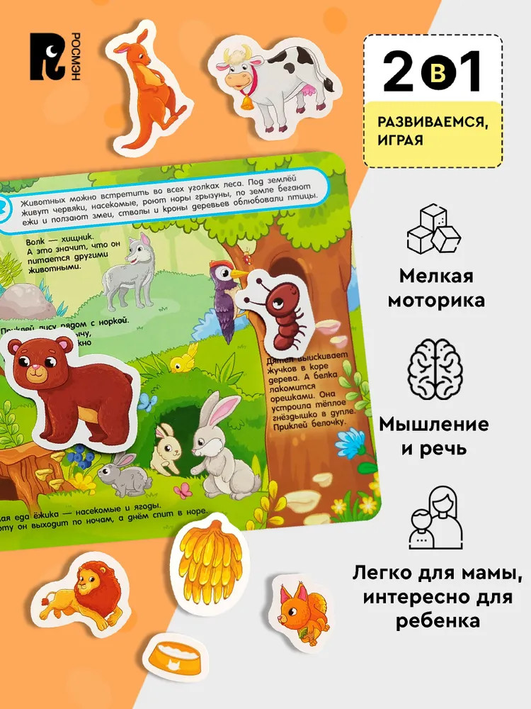 💳 Оплатить за товар можно при получении 🇰🇿 Есть бесплатная доставка по Казахстану от 1 дня 🎁 Копите бонусы с каждой покупки Серия: Книга с липучками Книга с липучками «Кто где живёт, кто что ест» — это яркие иллюстрации и интересные задания! Ваш малыш узнает, чем питаются и где живут дикие и домашние животные, как называются их домики. Его ждёт конверт с фигурками на липучках, для каждой из которых нужно найти место на страницах. Книги с липучками — это нескучные и полезные минуты для вашего ребёнка! |