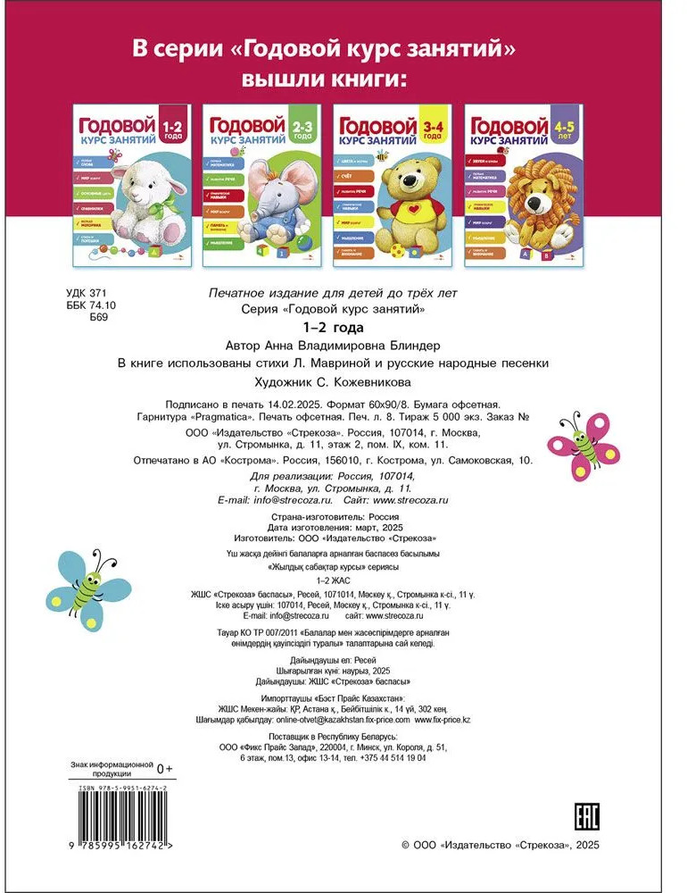 Серия: Годовой курс занятий Перед вами уникальная книга, созданная специально для того, чтобы помочь вашему малышу в возрасте от 1 до 2 лет активно развиваться и познавать окружающий мир. На страницах этой книги вы найдёте множество увлекательных заданий, которые не только развлекут вашего ребёнка, но и будут способствовать гармоничному развитию необходимых навыков. Задания в книге познакомят малыша с разнообразными темами: погода и природа, размер и цвета, тело и эмоции, одежда и обувь, гигиена и безопасность. В занятия включены ритмичные стишки-потешки, звукоподражательные говорилки и задания на жестовую имитацию. Это сделает процесс обучения более интересным и увлекательным. Пусть каждое занятие будет наполнено радостью и новыми открытиями! |
