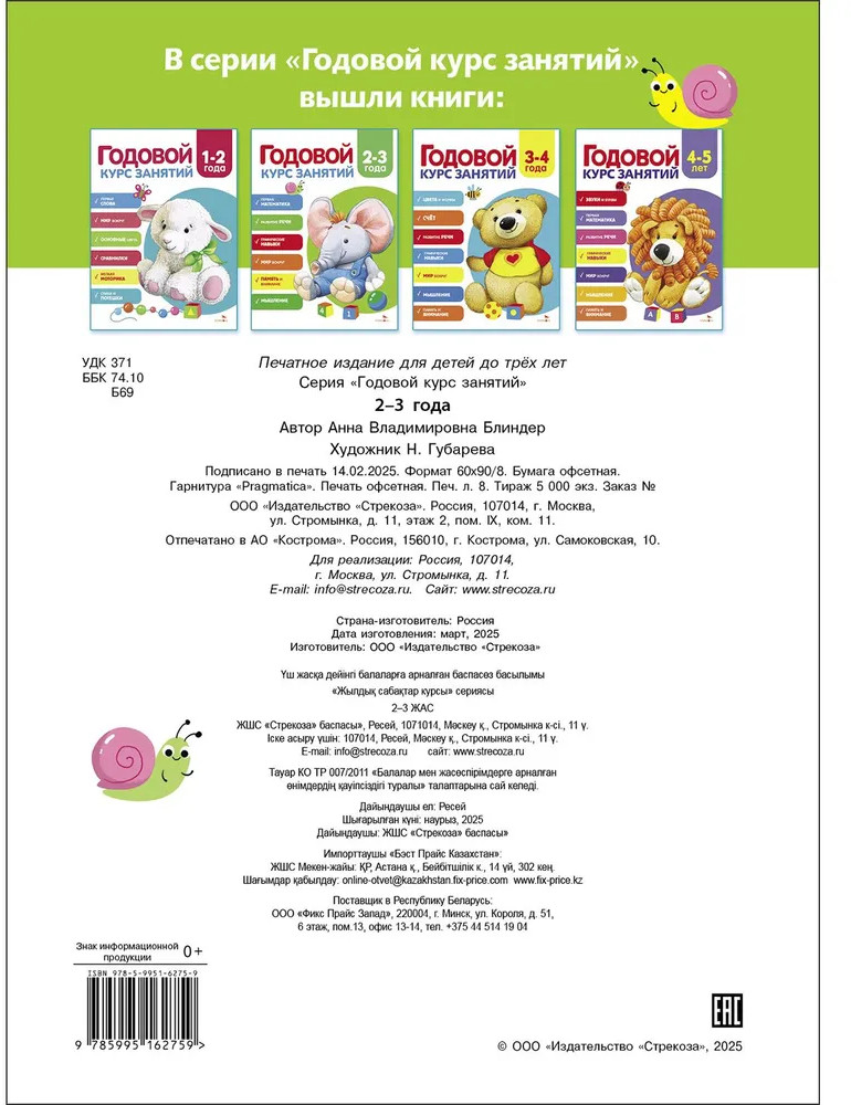 💳 Оплатить за товар можно при получении 🇰🇿 Есть бесплатная доставка по Казахстану от 1 дня 🎁 Копите бонусы с каждой покупки Серия: Годовой курс занятий Перед вами удивительная книга, созданная специально для детей в возрасте от 2 до 3 лет, чтобы помочь им активно развиваться и расширять свои знания об окружающем мире. На страницах этой книги вы найдёте множество интересных заданий, которые не только увлекут вашего ребёнка, но и будут способствовать гармоничному развитию необходимых навыков. Задания в книге познакомят малыша с разнообразными темами: животные и растения, цвет, форма и размер, мебель и одежда, эмоции, этикет. Каждый разворот книги предлагает уникальный сюжет, в котором ребёнок освоит новую тему вместе с героями — ребятами Ваней, Олей и Юлей. Вместе с ними ваш малыш будет играть, выполняя задания на картинках. Читайте книгу вслух, вместе с ребёнком разглядывайте яркие иллюстрации, помогайте ему находить ответы на вопросы, раскрашивайте и рисуйте вместе. В занятия включены ритмичные стишки и задания на жестовую имитацию. Это сделает процесс обучения более интересным и увлекательным. Пусть каждое занятие будет наполнено радостью и новыми открытиями! |