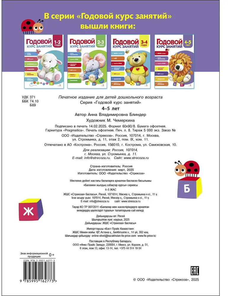 💳 Оплатить за товар можно при получении 🇰🇿 Есть бесплатная доставка по Казахстану от 1 дня 🎁 Копите бонусы с каждой покупки Серия: Годовой курс занятий Перед вами замечательная книга, созданная специально для детей в возрасте от 4 до 5 лет, чтобы помочь им активно развиваться и приобретать важные навыки. На страницах этой книги вы найдете множество занимательных заданий, связанных увлекательной историей приключений семьи Ромашкиных. Вместе с ними вам предстоит побывать в библиотеке, цирке, театре, музее, спортивном магазине и даже в океанариуме. Читайте книгу вслух, вместе с ребёнком разглядывайте яркие иллюстрации, помогайте ему находить ответы на вопросы, считать предметы, раскрашивать и рисовать. В книге вы найдете задания, направленные на развитие различных навыков: распознавать и называть цифры, считать предметы, распознавать и называть буквы. Ребенок получит новые знания о животных, птицах, динозаврах, космосе и различных предметах быта. Пусть каждое занятие будет наполнено радостью и новыми открытиями! |