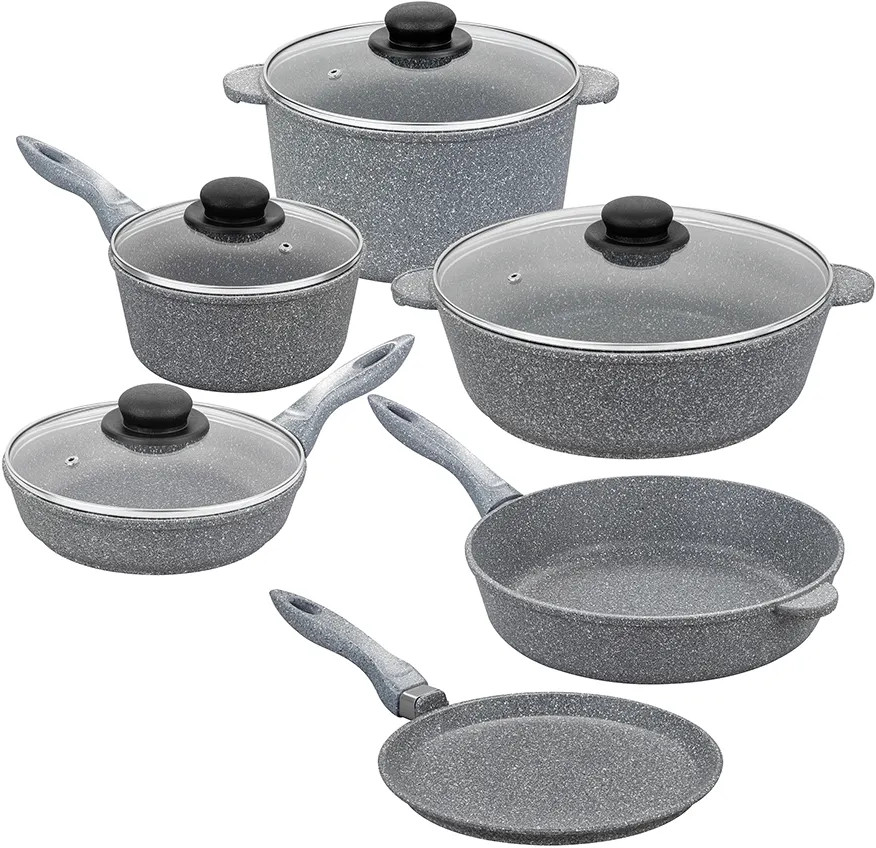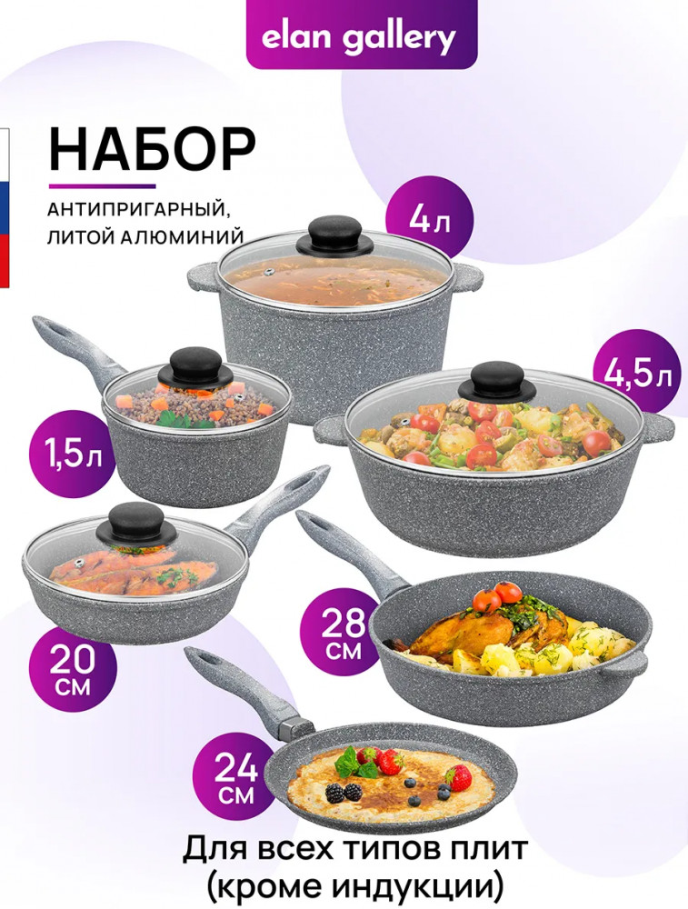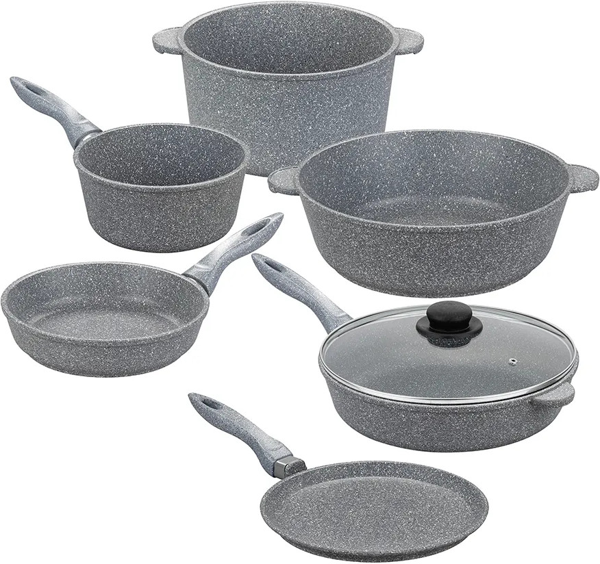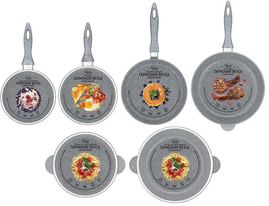 Набор из серии «Гармония вкуса» состоит из 10 предметов: сковорода глубокая 20 см с крышкой и сковорода глубокая 28 см, сковорода блинная 24 см, жаровня 4,5 литра с крышкой, кастрюля 4 литра с крышкой, ковш 1,5 литра с крышкой. Изготовлены из толстостенного алюминия и имеют ультрапрочное двухслойное покрытие Pfluon Cookmark. Оно устойчиво к износу и царапинам, не содержит PFOA и других вредных веществ, что делает его полностью безопасным для здоровья. Посуда равномерно распределяет тепло, благодаря чему продукты остаются вкусными, сочными и сохраняют все полезные свойства. Красивая алюминиевая посуда — мечта любой хозяйки. С её помощью вы легко приготовите вкусную пищу дома и на даче. Такая посуда станет прекрасным подарком маме или бабушке. В серии «Гармония вкуса» вы найдёте всё необходимое для того, чтобы приготовление любимых блюд стало комфортным и приятным. Соберите набор для вашей кухни в едином стиле и дополните свой инвентарь!