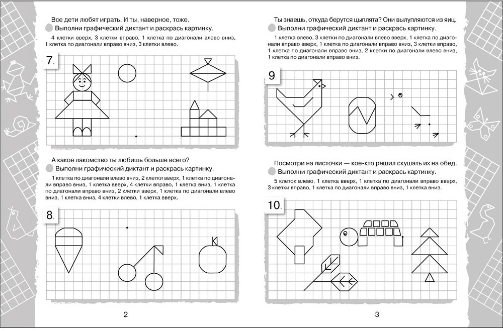 💳 Оплатить за товар можно при получении 🇰🇿 Есть бесплатная доставка по Казахстану от 1 дня 🎁 Копите бонусы с каждой покупки Серия: Графические диктанты Мы представляем вашему вниманию серию книг «Графические диктанты». Занимаясь по этим книгам, ребёнок сможет развить мелкую моторику, умение ориентироваться на листе бумаги, усидчивость и внимание. Интересные игровые сюжеты сделают работу по книге увлекательной! Попросите ребёнка под вашу диктовку выполнить задание, не отрывая карандаша от бумаги. Покажите ему точку, от которой нужно начинать выполнять задание. Не спешите диктовать задание целиком: прочтите сначала первый фрагмент, сделайте паузу и проследите, чтобы ребёнок правильно выполнил нужное действие. Только затем читайте следующий фрагмент и так далее, пока рисунок не будет готов. Будьте терпеливы и доброжелательны, и у вашего малыша всё получится! |