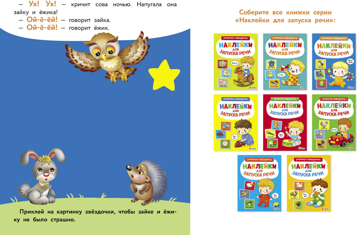 Серия: Ясельки. Наклейки для запуска речи Эта книга адресована самым маленьким читателям, которые ещё только-только начинают говорить. Для запуска речи нужно играть с малышом, разговаривать с ним, акцентируя внимание на самых простых словах. Полезно «озвучивать» предметы, рассказывайте ребёнку, как разговаривают животные. В этой книжке собраны небольшие истории со специально подобранными словами. А ещё в книге есть наклейки. Они очень простые по форме. Малышу будет удобно приклеивать их на картинки. Работа с наклейками — отличный способ развивать мелкую моторику и, соответственно, речь. Надеемся, что наша книга поможет вам с пользой провести время и ощутить радость общения с вашим ребёнком. |