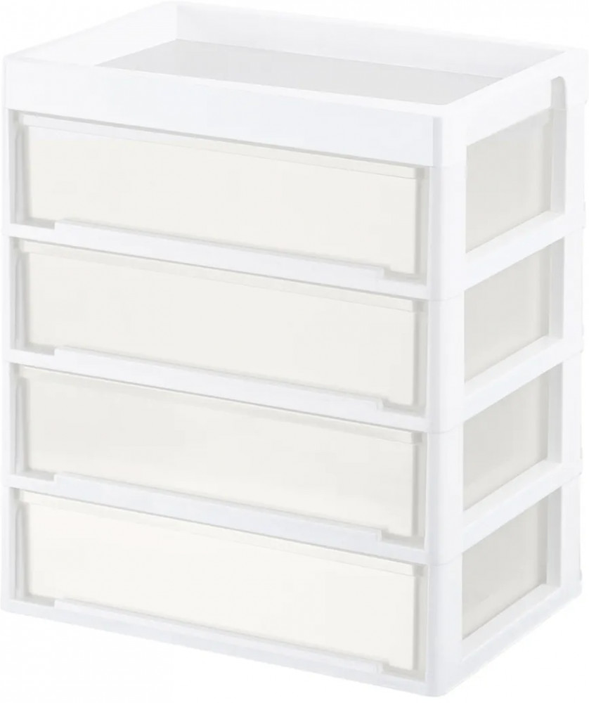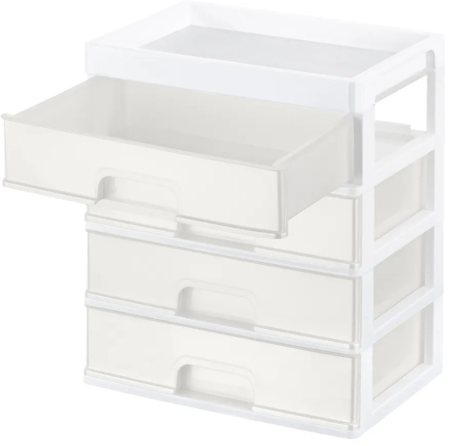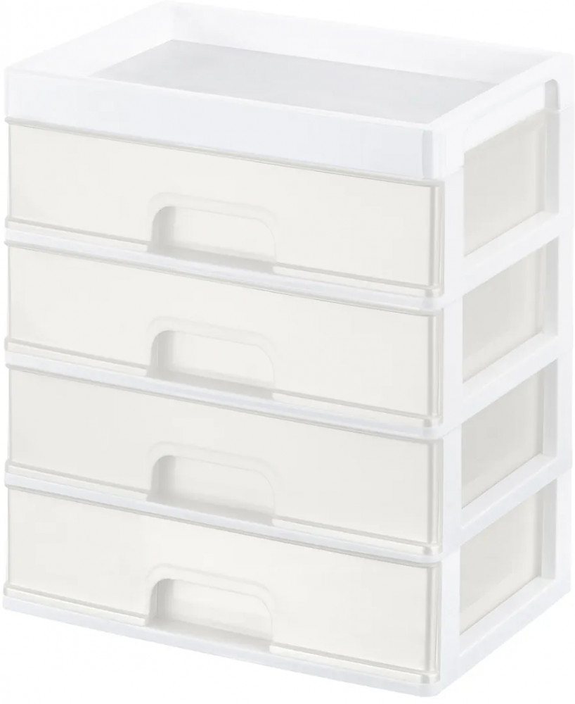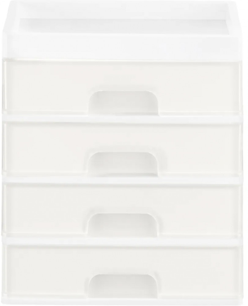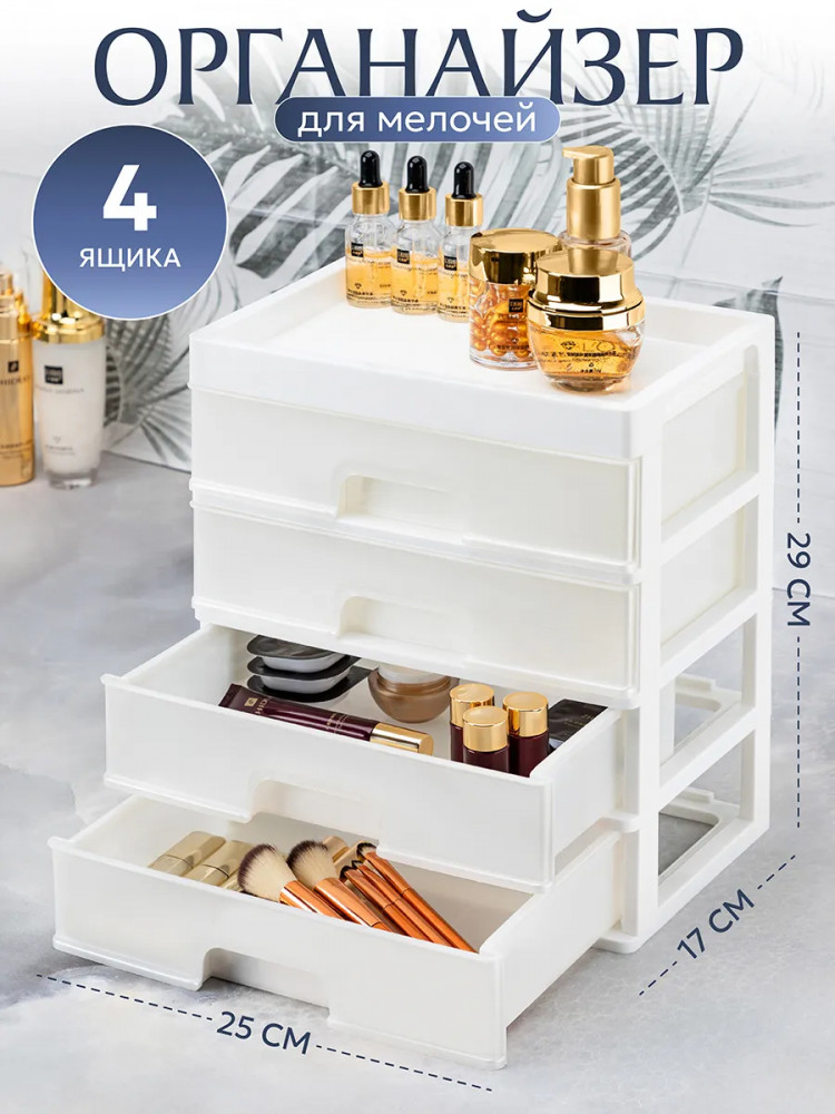 Настольный органайзер от El Casa станет универсальным решением для хранения самых разнообразных мелочей. Размер изделия — 25×17×29 см, внутренний размер каждого ящичка по дну — 23×16,5×5,5 см. Имеет 4 выдвижных ящика и верхнюю секцию с бортиками. Выполнен из полипропилена — прочного пищевого пластика, не содержащего бисфенол А и не выделяющего вредные вещества. Благодаря этому пластиковый контейнер подойдёт для хранения уходовой и декоративной косметики, а также косметических и маникюрных принадлежностей.