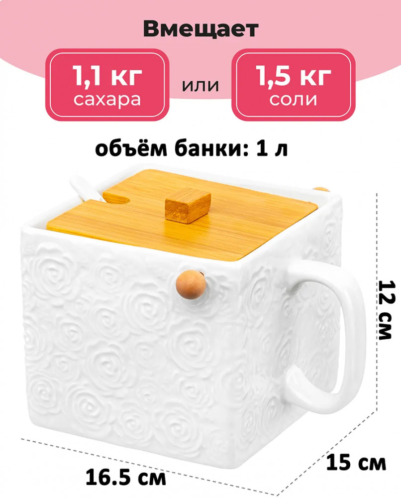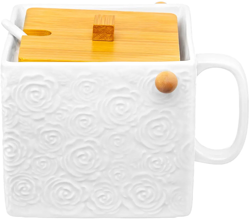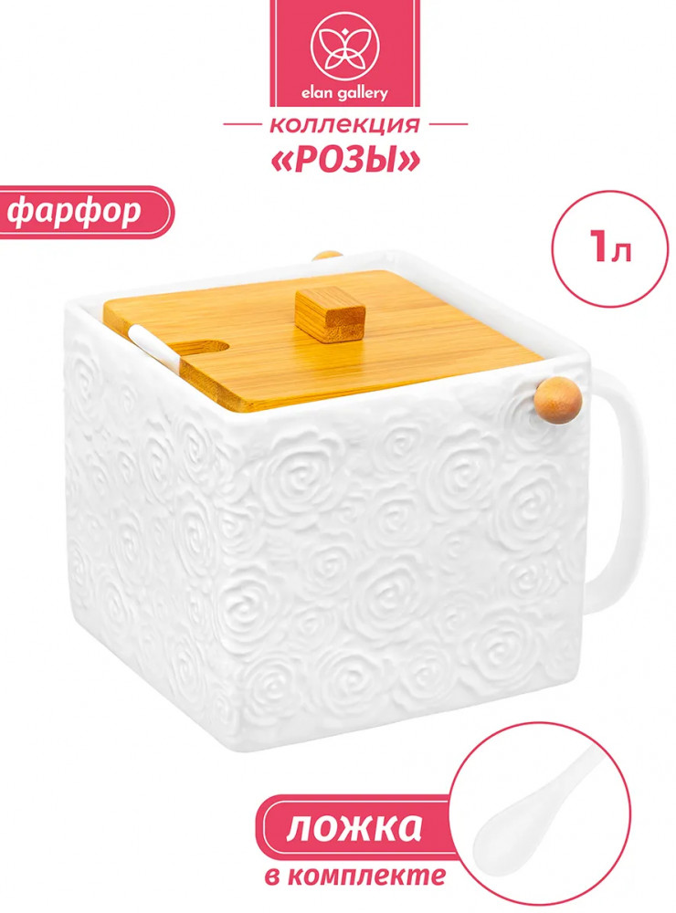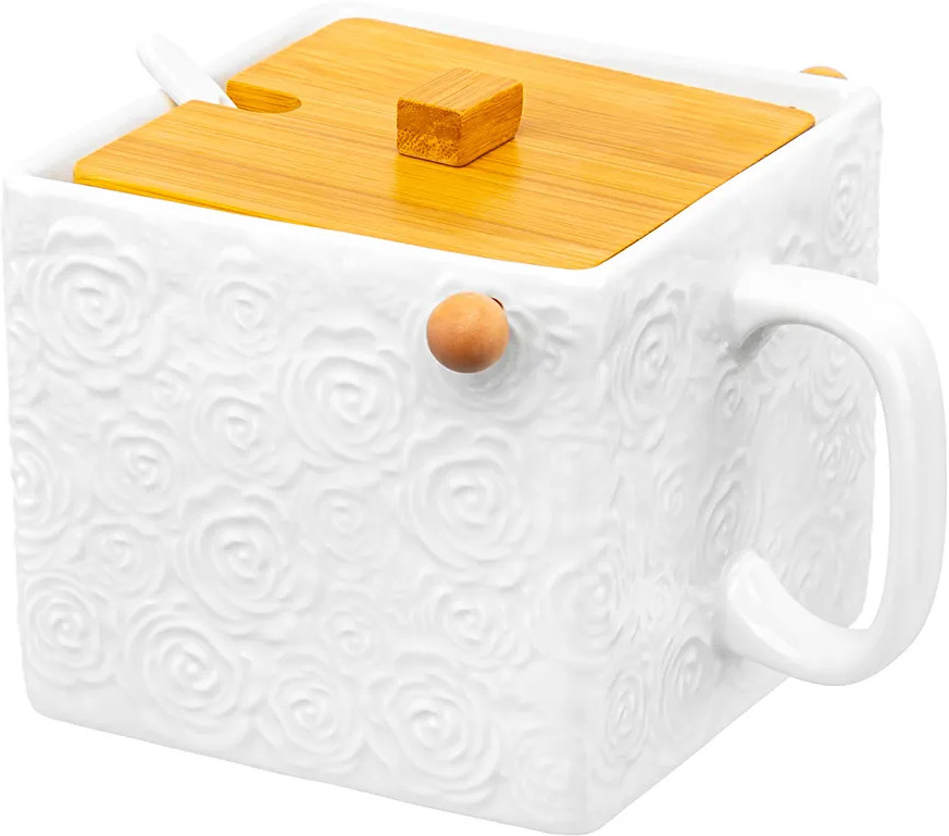 Сахарница из серии «Розы» от Elan Gallery послужит для организации хранения сыпучих продуктов на вашей кухне. Размер ёмкости — 16,5×15×12 см, объём — 1 литр. Вмещает 1,1 килограмма сахара или 1,5 килограмма соли. Выполнена из высококачественного белого фарфора. Он не впитывает цвет продуктов и легко отмывается, благодаря чему надолго сохраняет свою белизну. Поверхность изделий украшают рельефные узоры в виде пышных бутонов роз. Откидная крышка выполнена из натурального бамбука и оснащена удобной ручкой. Ёмкость подойдёт для хранения разнообразных сыпучих продуктов. Заполните её сахаром, солью, а также другими специями и приправами, чтобы во время приготовления и приёма пищи всё необходимое было под рукой. Засыпьте внутрь чай или кофе, чтобы в любой момент заварить свежий напиток. Храните в ней крупы и макаронные изделия, ягоды, орехи и сухофрукты. Заполните контейнер сладостями: конфетами, леденцами, пряниками или печеньем. Подайте баночку к столу, чтобы идеально дополнить чайную сервировку! Герметичная бамбуковая крышечка защитит ваши продукты от попадания грязи и пыли. Ложечка поможет вам набрать необходимое количество продуктов и компактно помещается в баночке.