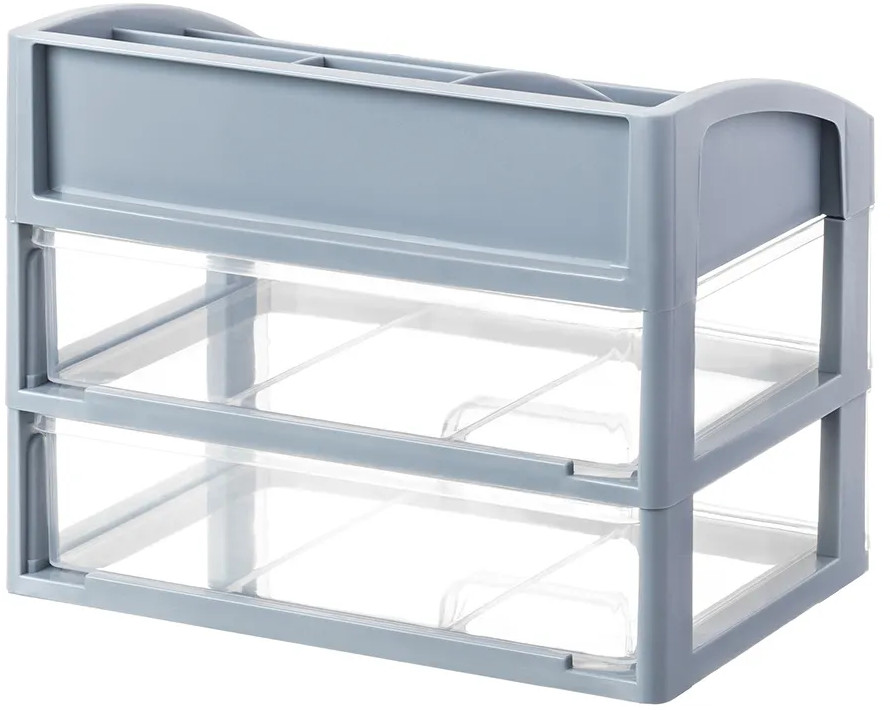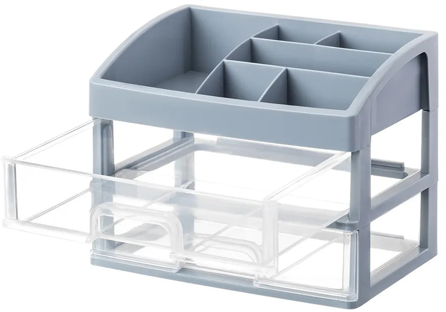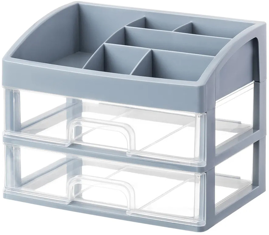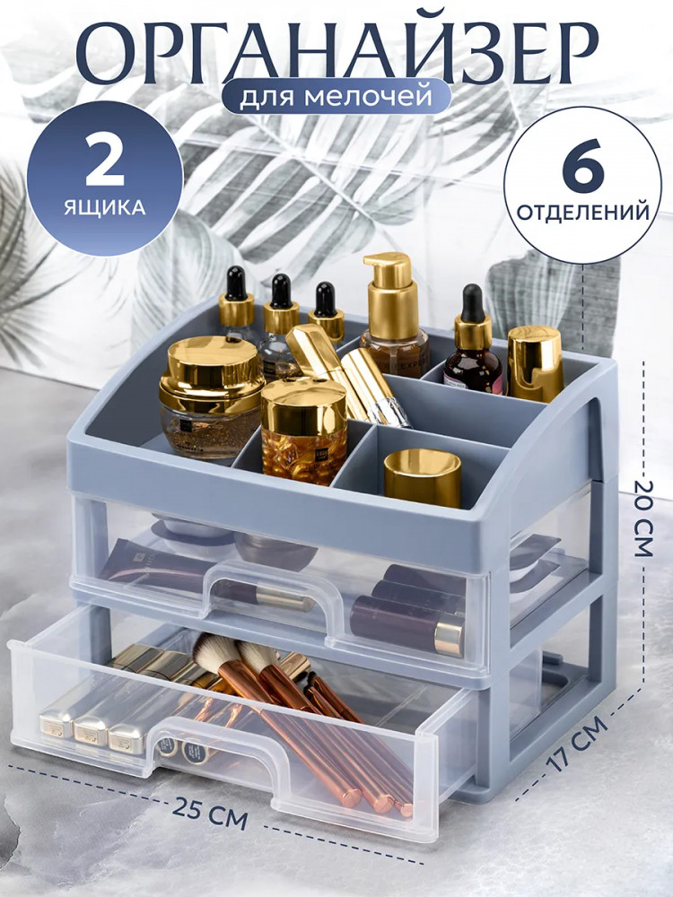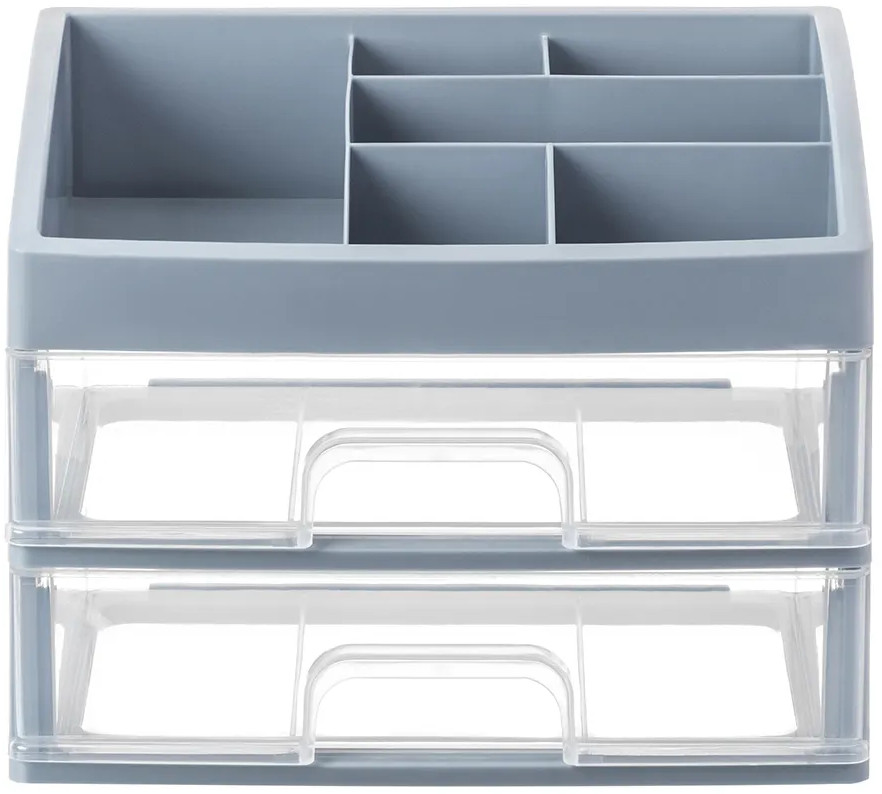 Настольный органайзер от El Casa станет универсальным решением для хранения самых разнообразных мелочей. Размер изделия — 25×17×22 см, внутренний размер каждого ящичка по дну — 23×16,5×5,5 см. Имеет 2 выдвижных ящика и верхнюю секцию с 6 отделениями разных размеров. Выполнен из полипропилена — прочного пищевого пластика, не содержащего бисфенол А и не выделяющего вредные вещества. Благодаря этому пластиковый контейнер подойдёт для хранения уходовой и декоративной косметики, а также косметических и маникюрных принадлежностей.