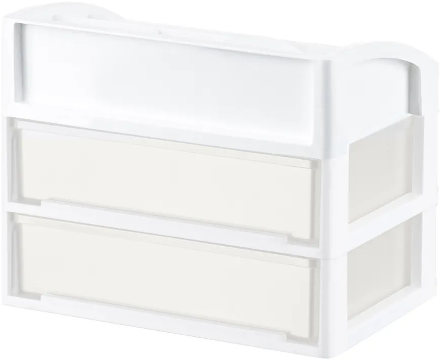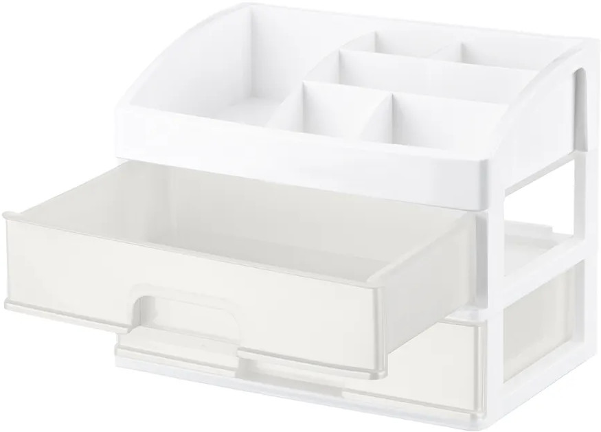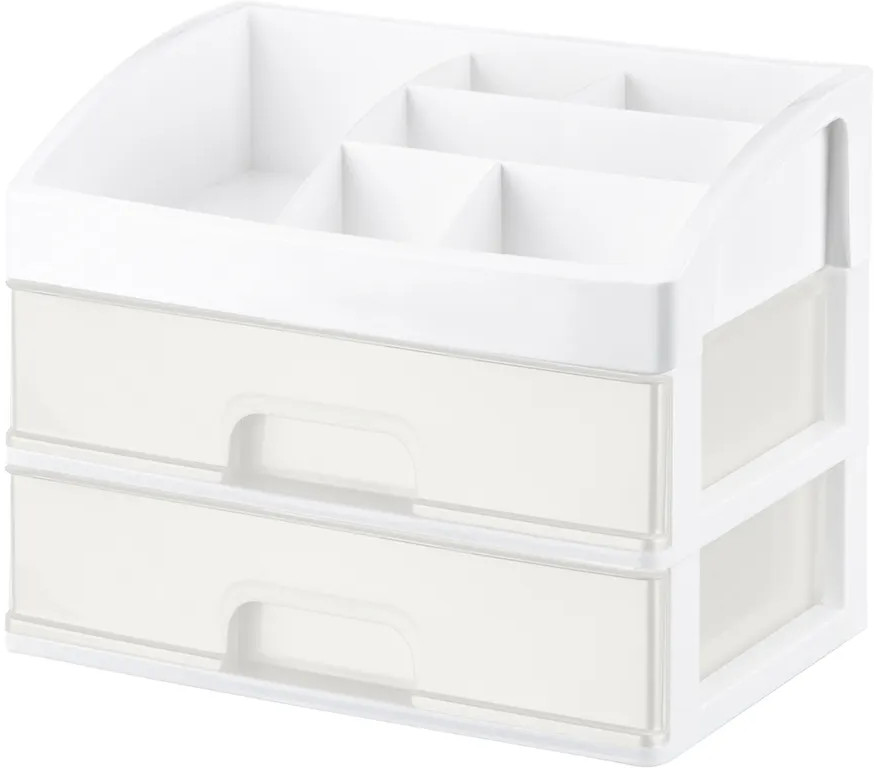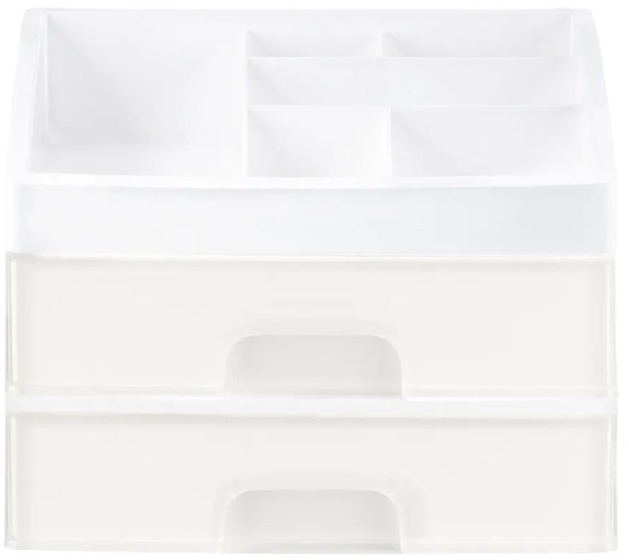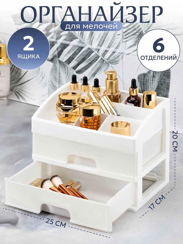 Настольный органайзер от El Casa станет универсальным решением для хранения самых разнообразных мелочей. Размер изделия — 25×17×22 см, внутренний размер каждого ящичка по дну — 23×16,5×5,5 см. Имеет 2 выдвижных ящика и верхнюю секцию с 6 отделениями разных размеров. Выполнен из полипропилена — прочного пищевого пластика, не содержащего бисфенол А и не выделяющего вредные вещества. Благодаря этому пластиковый контейнер подойдёт для хранения уходовой и декоративной косметики, а также косметических и маникюрных принадлежностей.