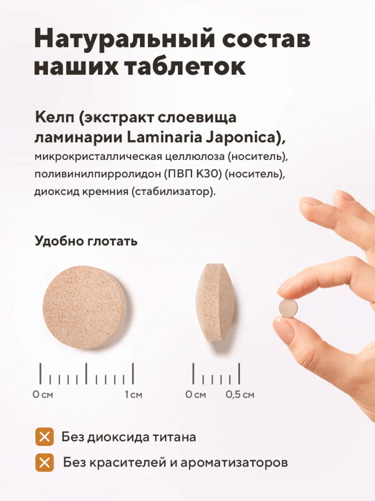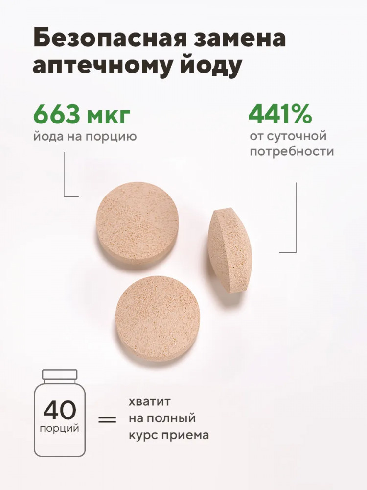 Дозировка келпа рассчитана с учетом максимальной пользы: 1 таблетка содержит 221 мкг органического йода. Дневная порция келпа (3 таблетки) содержит 663 мкг органического йода, что составляет 441% от суточной нормы.