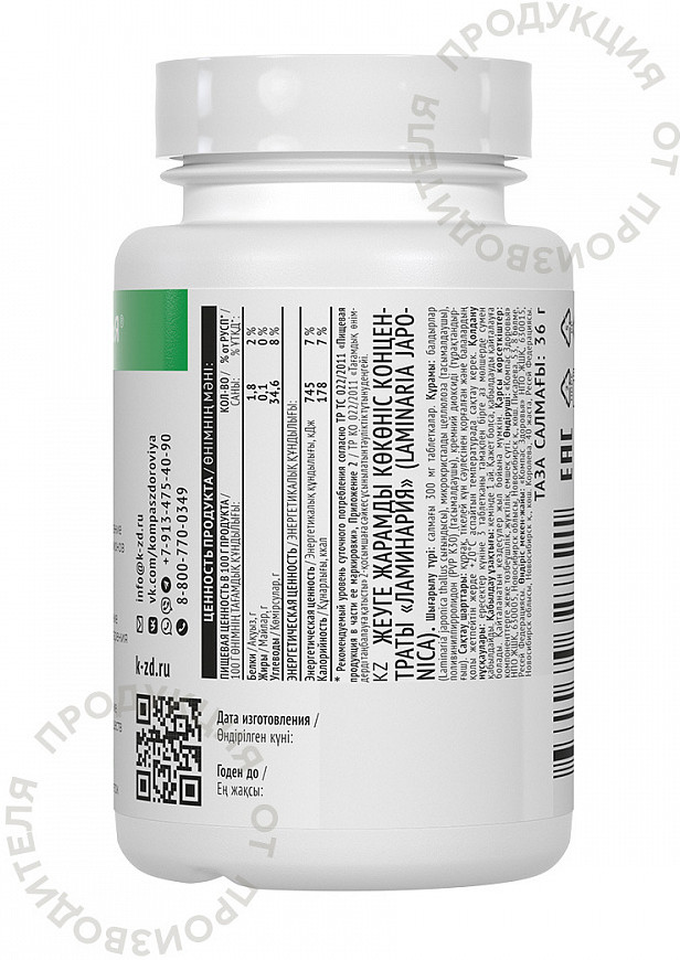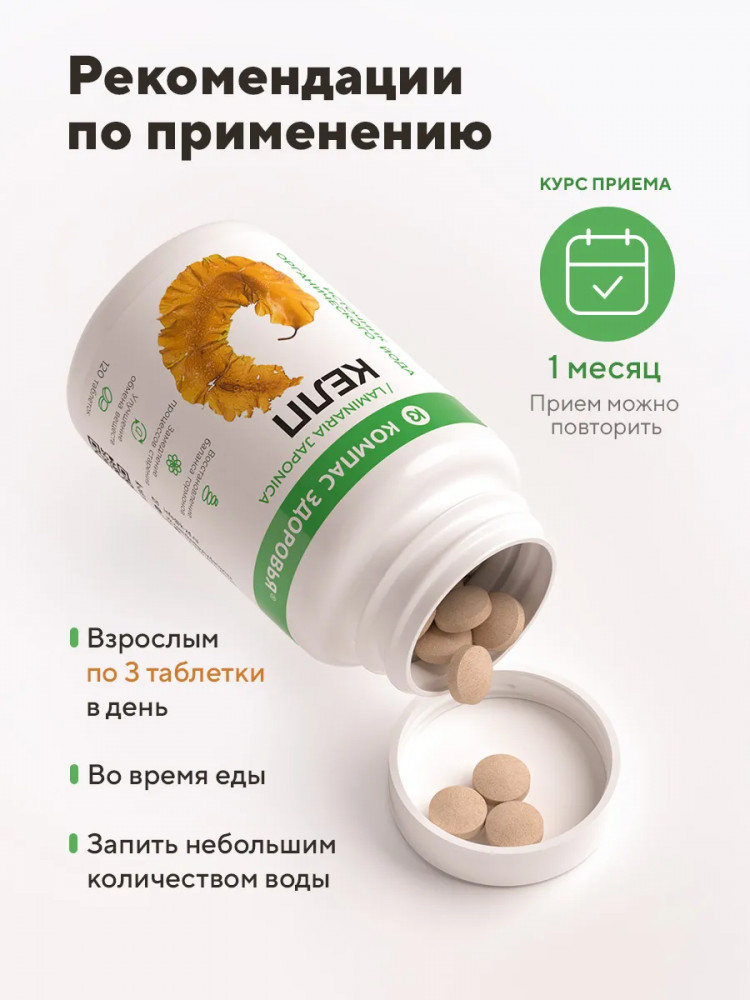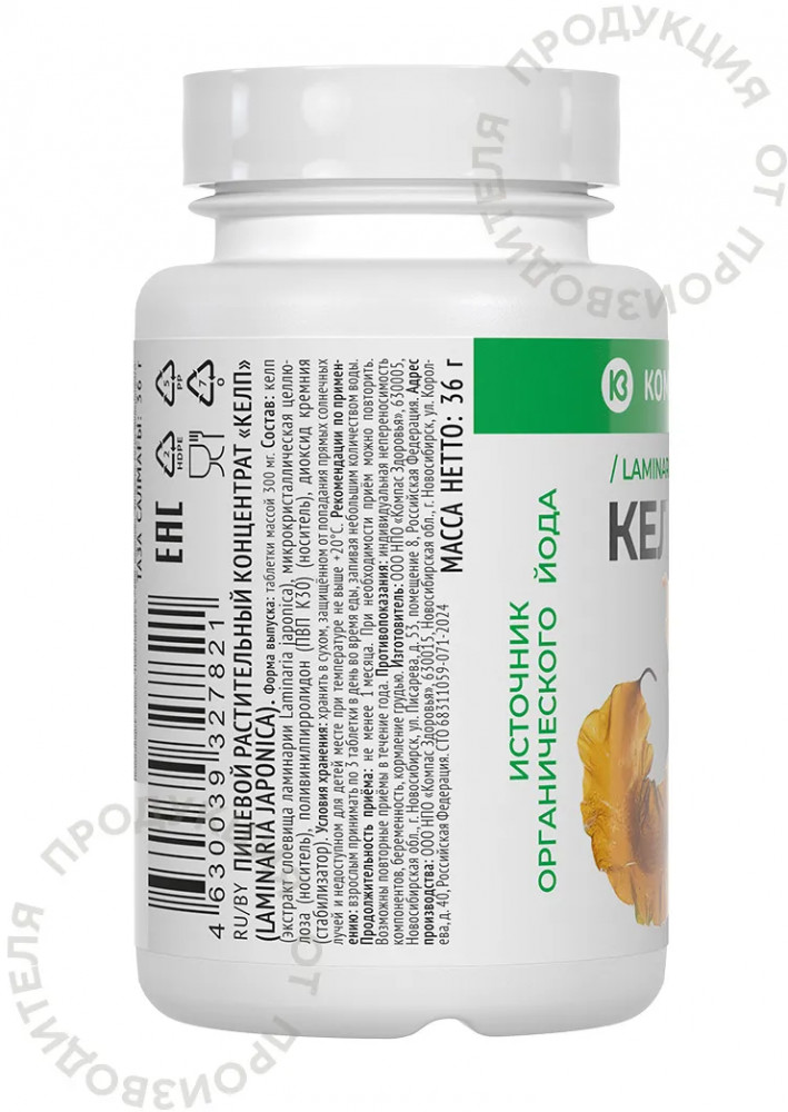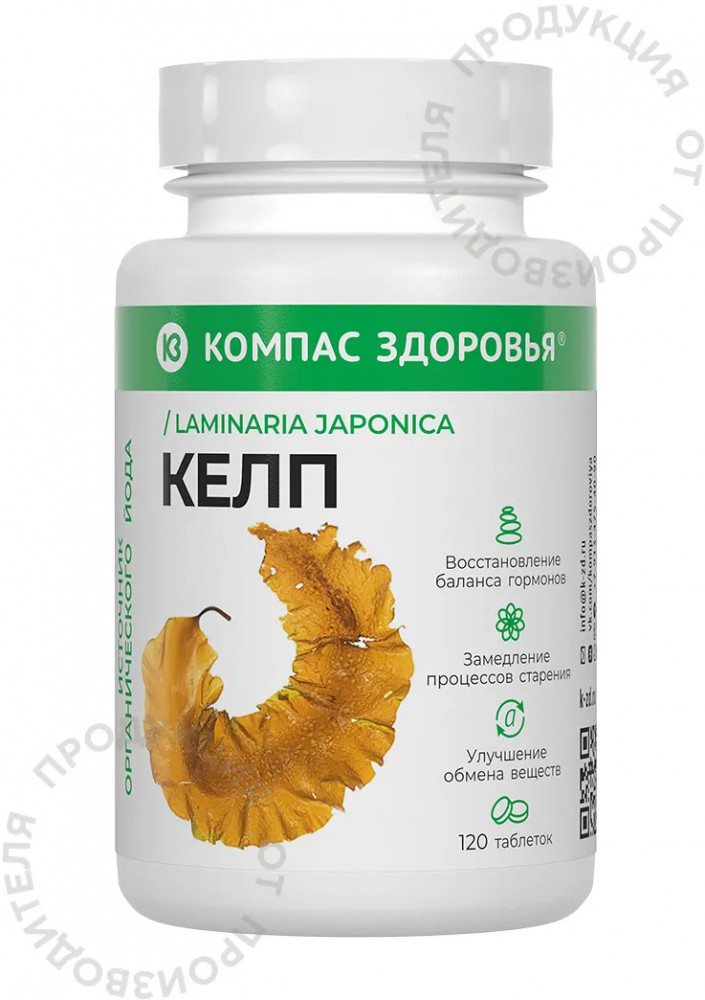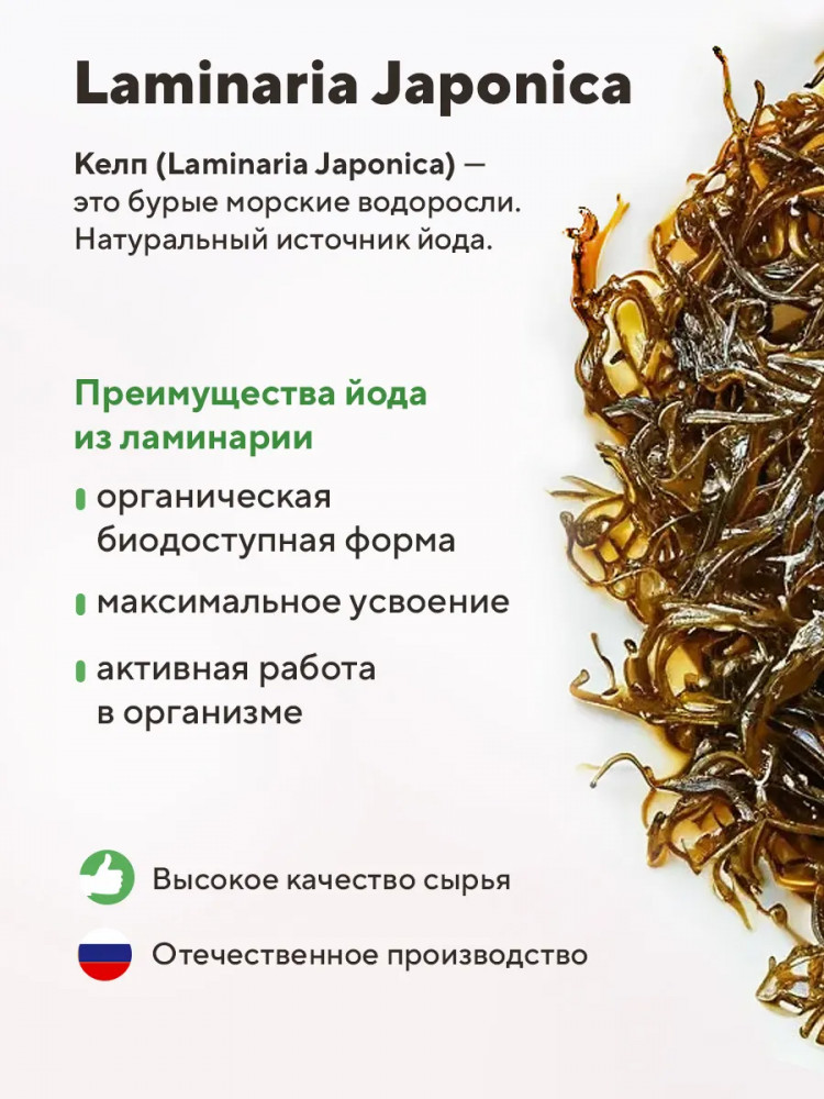 Келп от бренда Компас Здоровья — это органический йод, полученный из экстракта Laminaria Japonica (бурые морские водоросли).