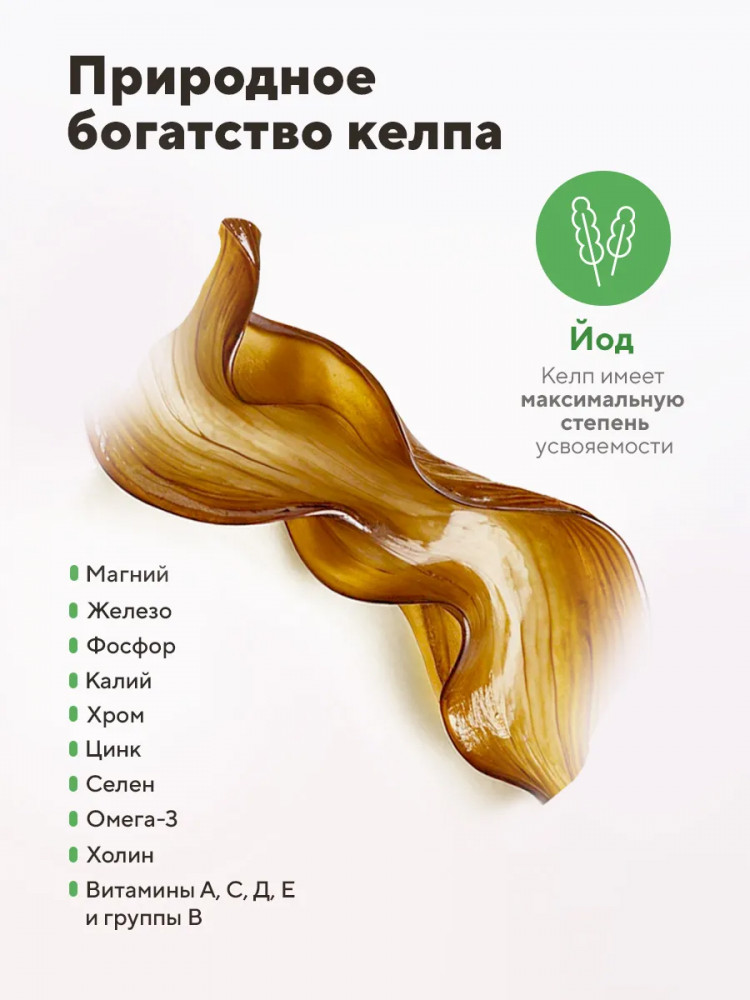 Йод в ламинарии содержится в органической биодоступной форме, что гарантирует его максимальное усвоение и активную работу в организме. Этот продукт способствует нормальному функционированию щитовидной железы и гормональной системы. Регулярное употребление йода помогает нормализовать обмен веществ, что особенно важно для контроля веса и поддержания здоровья при гипотиреозе или гипертиреозе. Органический йод из келпа оказывает стимулирующее воздействие на иммунную систему и работу мозга, улучшая память и повышая уровень энергии. Он также способствует очищению организма от шлаков и токсинов, улучшая общее состояние здоровья. Благодаря высокому содержанию йода, добавка помогает предотвратить дефицит йода, который может привести к таким заболеваниям, как зоб или увеличение щитовидной железы. Келп богат йодом, железом, магнием, фосфором, калием, хромом, цинком, селеном, холином, содержит Омега-3, витамины А, C, Д, Е и группы В.