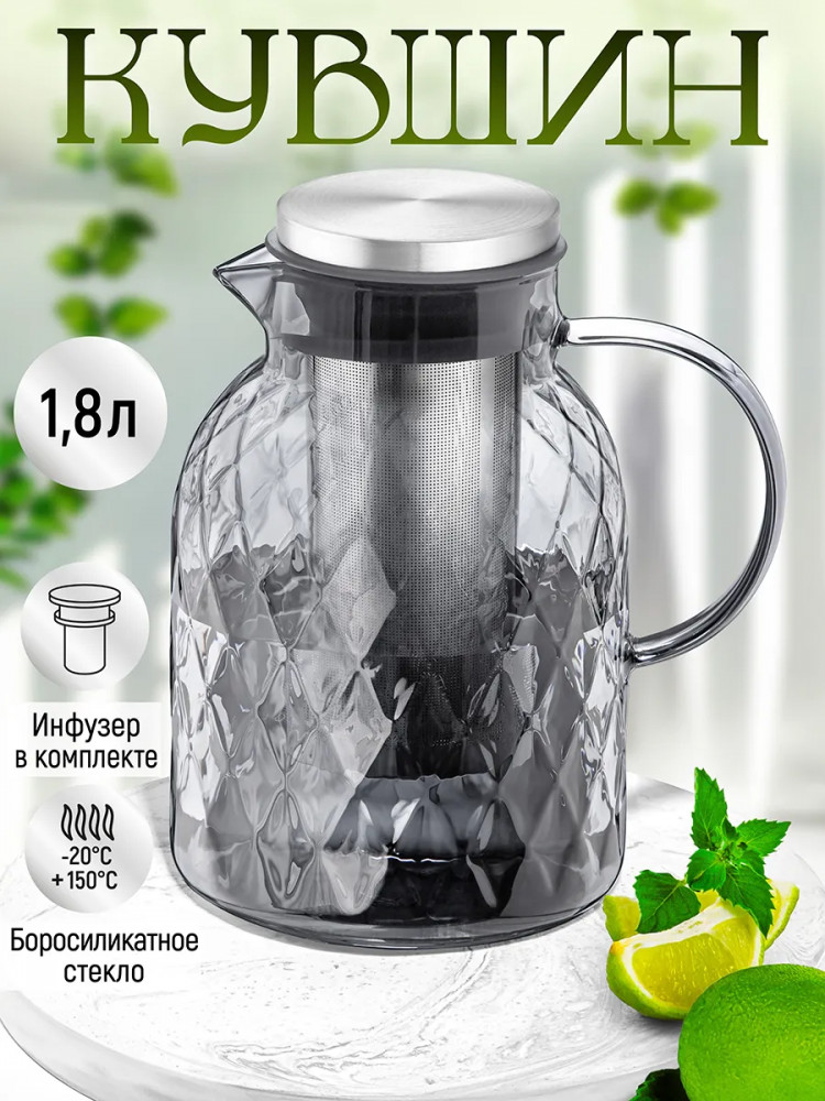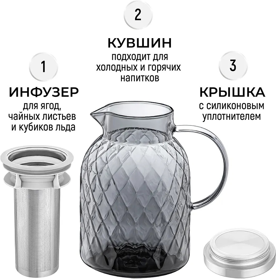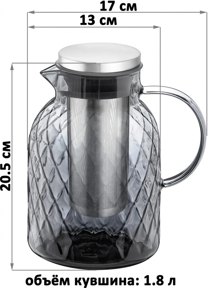 Кувшин из серии «Crystal glass» от Elan Gallery предназначен для эстетичной сервировки вашего стола. Размер изделия — 17×13×20,5 см, объём — 1,8 литров. Выполнен из жаропрочного боросиликатного стекла, не содержащего вредных веществ, не впитывающего запахи и вкусы. Оно выдерживает температуру от -20 до +150 градусов и подходит как для горячих, так и для прохладительных напитков. Крышка выполнена из нержавеющей стали и оснащена силиконовым уплотнителем, благодаря чему надёжно защищает содержимое от проливания, а также пыли и грязи. Инфузер из нержавеющей стали облегчит заваривание — поместите в него чайные листья, кусочки фруктов или лёд. Ваш напиток получится чистым, без чаинок и соринок. Ёмкость можно приспособить как для чистой питьевой воды, так и под алкогольные напитки на празднике. Термостойкий кувшин позволит вам наслаждаться любимыми напитками в любое время года. Жарким летом угоститесь холодным лимонадом или ягодным компотом. Используйте кувшин как лимонадницу или для эстетичной сервировки вина и коктейлей. Зимой или дождливой осенью наслаждайтесь горячим ароматным глинтвейном.