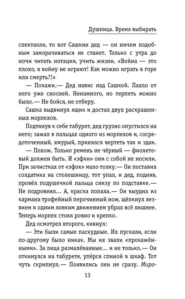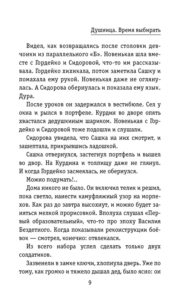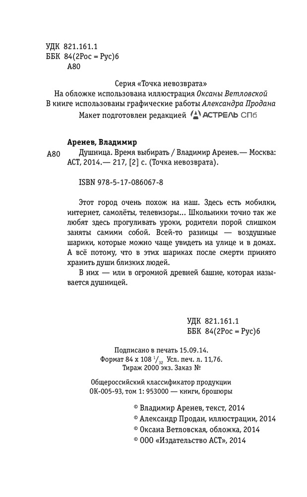 Душница. Время выбиратьВ данный момент этот товар отсутствует в продаже. Возможно, у нас найдется аналогичный или похожий товар здесь. Серия: Точка невозврата Этот город очень похож на наш. Здесь есть мобилки, интернет, самолеты, телевизоры... Школьники точно так же любят здесь прогуливать уроки, родители порой слишком заняты самими собой. Всей-то разницы — воздушные шарики, которые можно чаще увидеть на улице и в домах. А все потому, что в этих шариках после смерти принято хранить души близких людей. В них — или в огромной древней башне, которая называется душницей. |