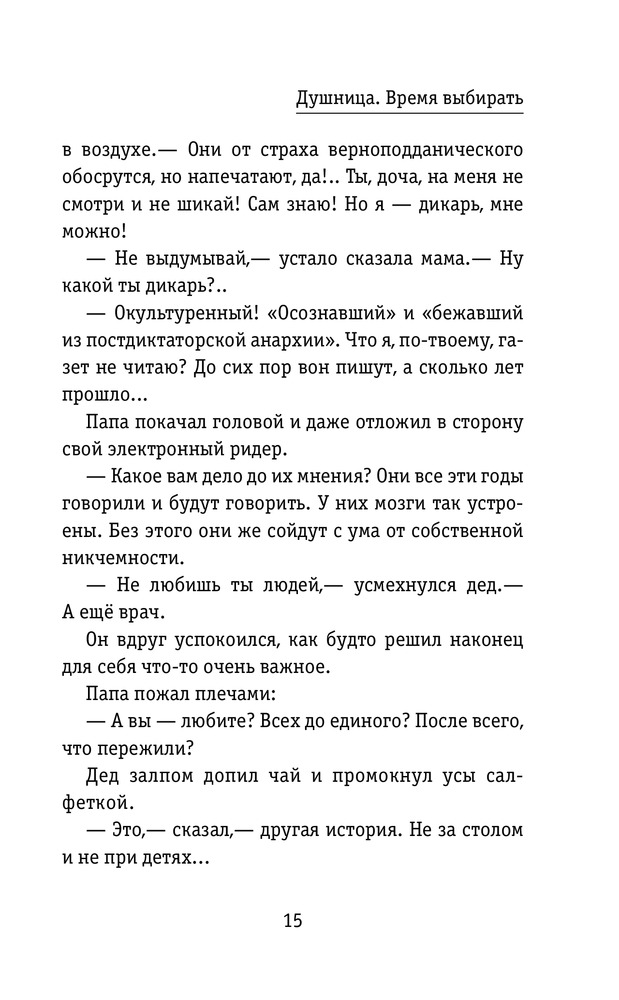 Возможно вопросы и серьёзные поднимаются, но читать скучно, событийности нет. Дочитала до середины и посмотрела конец, и поняла, что предугадала его. Всё предсказуемо. Хотя оформлено неплохо и шрифт располагает к быстрому прочтению.