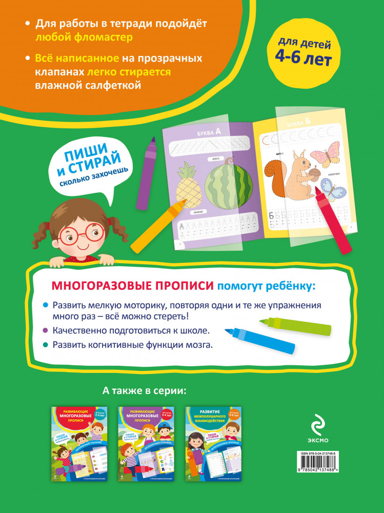 💳 Оплатить за товар можно при получении 🇰🇿 Есть бесплатная доставка по Казахстану от 1 дня 🎁 Копите бонусы с каждой покупки Серия: Многоразовые прописи с прозрачными клапанами Эти необычные многоразовые прописи помогут детям 4-6 лет развить мелкую моторику и научиться писать печатные буквы. Бумажные страницы справа и слева накрываются прозрачными клапанами из специального материала — по нему можно многократно писать любым фломастером или маркером, а потом стирать написанное влажной салфеткой. Пользоваться такими прописями можно бесконечно долго, совершенствуя правильность выполнения графических заданий и точность написания букв. Развитие мелкой моторики способствует совершенствованию когнитивных функций мозга: памяти, внимания, логического мышления, которые помогут ребёнку эффективнее учиться. Лучше, если ребёнок начнёт знакомиться с пособием в присутствии взрослого, который может задать наводящие вопросы или попросить выполнить какое-то задание несколько раз. В дальнейшем дошкольник может с удовольствием выполнять знакомые упражнения самостоятельно. Ребёнок будет писать в прописях много-много раз, не задумываясь: «А вдруг не получится?» |