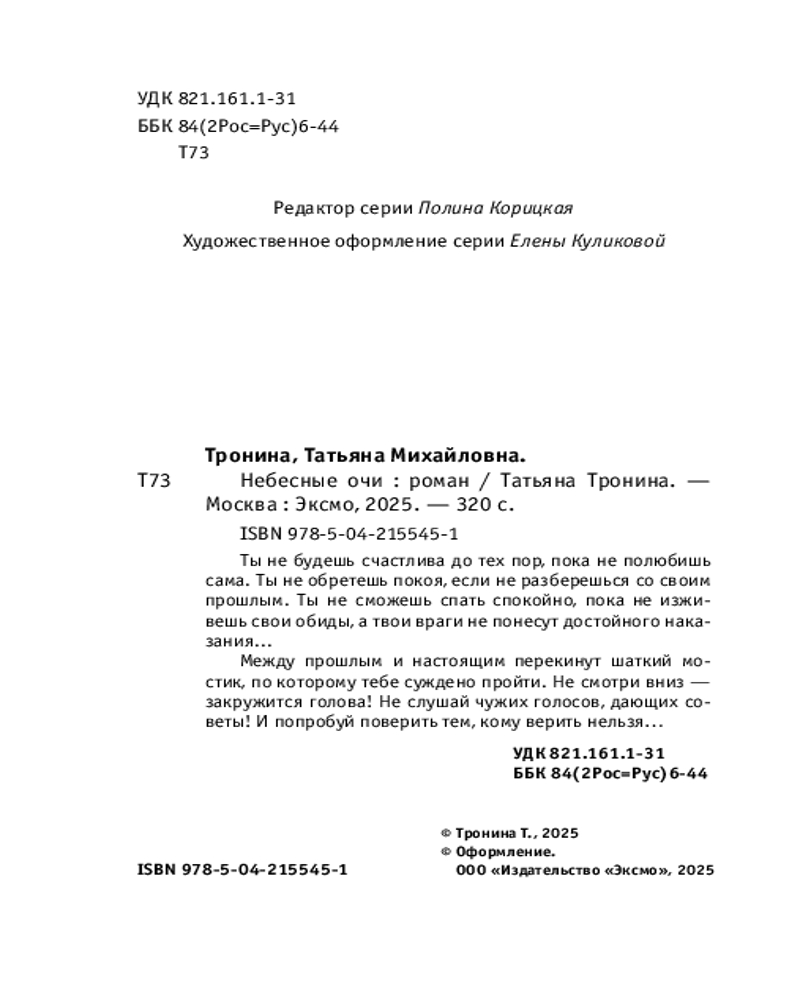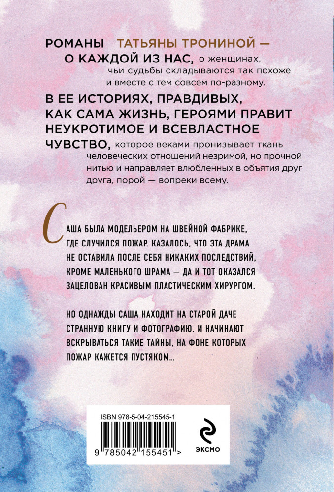 💳 Оплатить за товар можно при получении 🇰🇿 Есть бесплатная доставка по Казахстану от 1 дня 🎁 Копите бонусы с каждой покупки Серия: Нити любви. Романы Т. Трониной (обложка) Ты не будешь счастлива до тех пор, пока не полюбишь сама. Ты не обретешь покоя, если не разберешься со своим прошлым. Ты не сможешь спать спокойно, пока не изживешь свои обиды, а твои враги не понесут достойного наказания... |