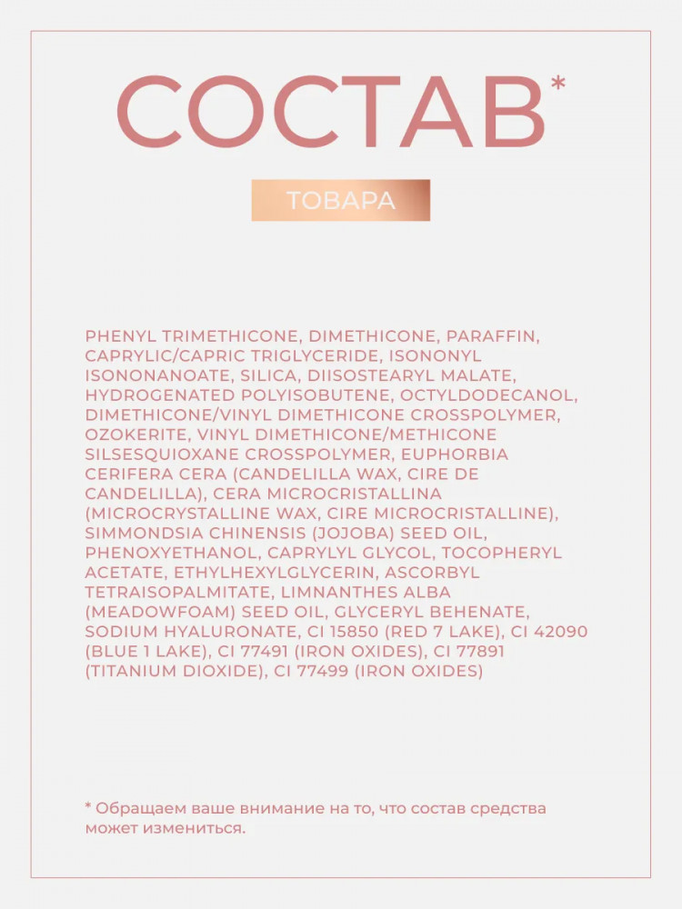 Phenyl Trimethicone, Dimethicone, Paraffin, Caprylic/capric Triglyceride, Isononyl Isononanoate, Silica, Hydrogenated Polyisobutene, Diisostearyl Malate, Octyldodecanol, Dimethicone/vinyl Dimethicone Crosspolymer, Ozokerite, Vinyl Dimethicone/methicone Silsesquioxane Crosspolymer, Euphorbia Cerifera Cera (candelilla Wax, Cire De Candelilla), Cera Microcristallina (microcrystalline Wax, Cire Microcristalline), Simmondsia Chinensis (jojoba) Seed Oil, Phenoxyethanol, Caprylyl Glycol, Tocopheryl Acetate, Ascorbyl Tetraisopalmitate, Ethylhexylglycerin, Limnanthes Alba (meadowfoam) Seed Oil, Glyceryl Behenate, Sodium Hyaluronate, Ci 77891 (titanium Dioxide), Ci 77491 (iron Oxides), Ci 15850 (red 7 Lake), Ci 77492 (iron Oxides).