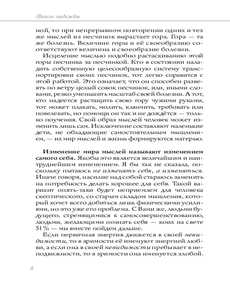 💳 Оплатить за товар можно при получении 🇰🇿 Есть бесплатная доставка по Казахстану 🎁 Копите бонусы с каждой покупки Серия: Свет исцеления (обложка) «Тепло надежды» помогает читателю понять, что надежда в самом широком смысле этого слова заставляет наш организм функционировать в полную силу, трата же ее ведет к болезни. По мнению доктора Виилмы, каждый из нас может исцелиться, соединив вновь обретенную надежду, любовь и прощение. Книга мягко направляет читателей на путь познания собственной души, путь прощения, путь обретения здоровья. И написана она особым почтовым стилем, оказывающим целительное воздействие на душу и тело. |