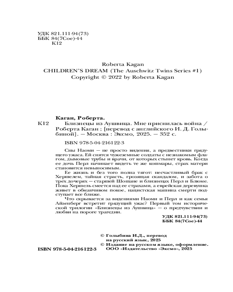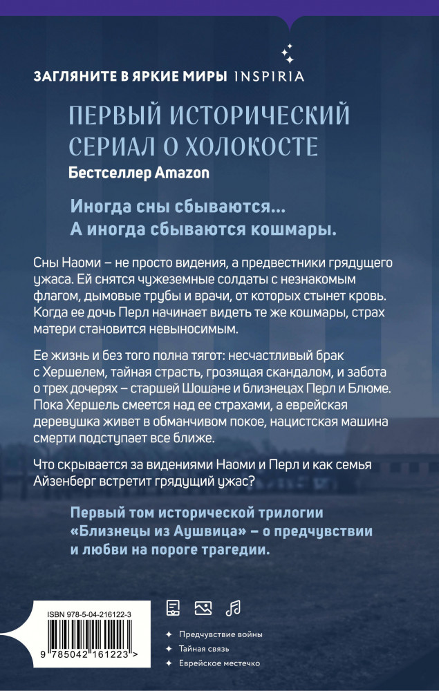 💳 Оплатить за товар можно при получении 🇰🇿 Есть бесплатная доставка по Казахстану от 1 дня 🎁 Копите бонусы с каждой покупки Серия: Novel. Женщины войны. Близнецы из Аушвица Сны Наоми — не просто видения, а предвестники грядущего ужаса. Ей снятся чужеземные солдаты с незнакомым флагом, дымовые трубы и врачи, от которых стынет кровь. Когда ее дочь Перл начинает видеть те же кошмары, страх матери становится невыносимым. Ее жизнь и без того полна тягот: несчастливый брак с Хершелем, тайная страсть, грозящая скандалом, и забота о трех дочерях — старшей Шошане и близнецах Перл и Блюме. Пока Хершель смеется над ее страхами, а еврейская деревушка живет в обманчивом покое, нацистская машина смерти подступает все ближе. |