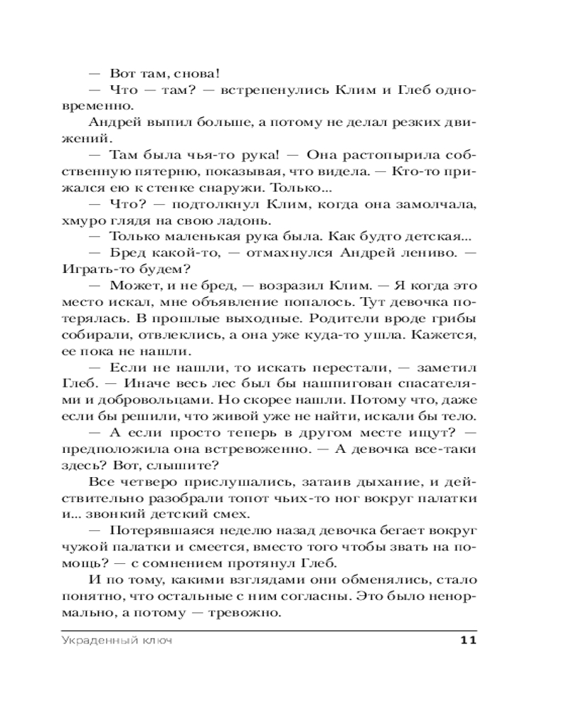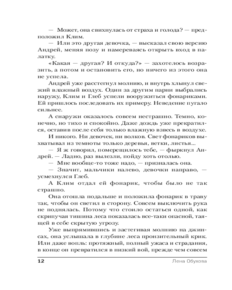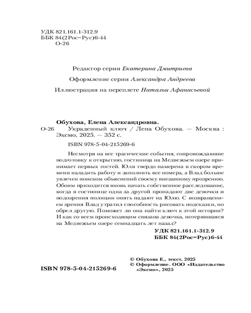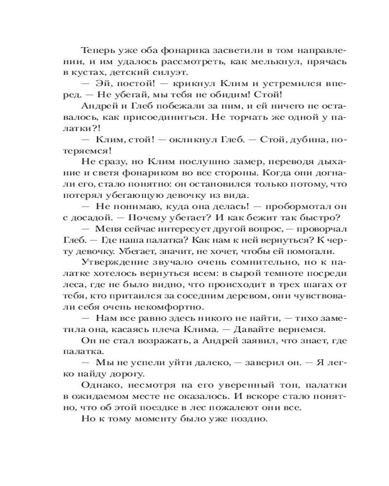 💳 Оплатить за товар можно при получении 🇰🇿 Есть бесплатная доставка по Казахстану от 1 дня 🎁 Копите бонусы с каждой покупки Серия: Городские легенды Лены Обуховой Несмотря на все трагические события, сопровождавшие подготовку к открытию, гостиница на Медвежьем озере принимает первых гостей. Юля твердо намерена в скором времени наладить работу и заполнить все номера, а Влад больше увлечен поиском объяснений своему внезапному прозрению. Обоим приходится вновь начать собственное расследование, когда в гостинице одна за другой пропадают две девочки, и подозрения полиции опять падают на Юлю. С возвращением зрения Влад утратил способность рисовать подсказки, но обрел другую. Поможет ли она найти ключ к этой истории? И как со всем происходящим связана девочка, потерявшаяся на Медвежьем озере семнадцать лет назад? |