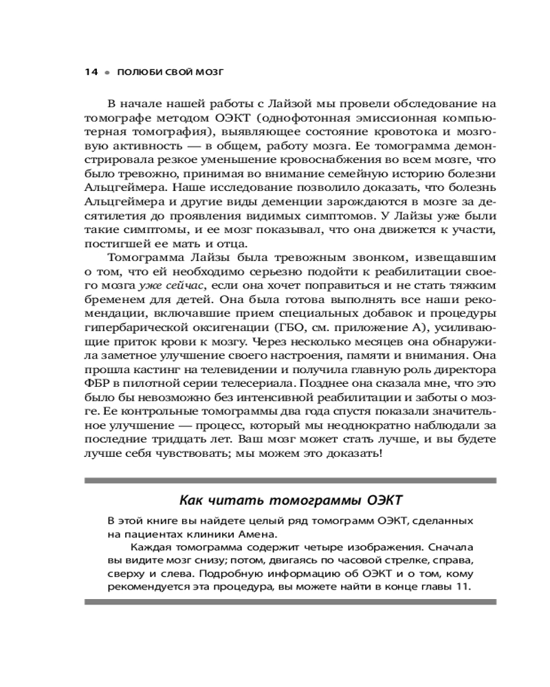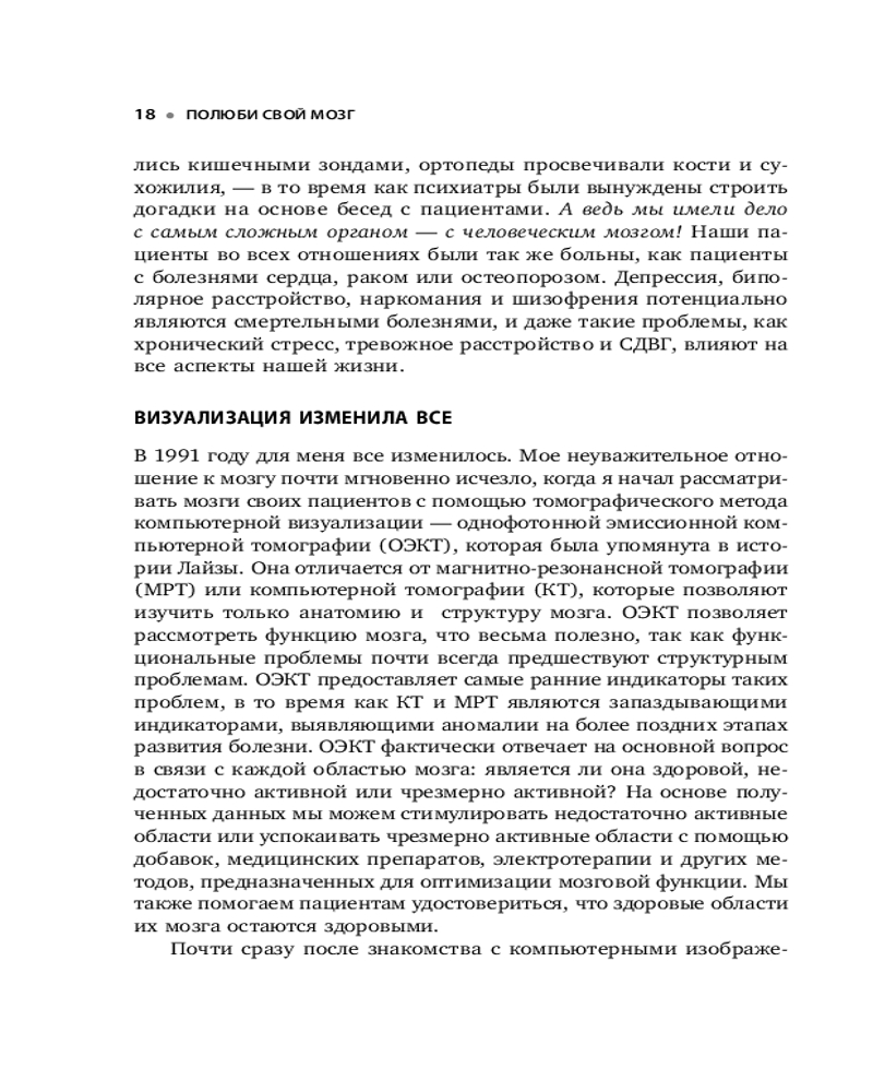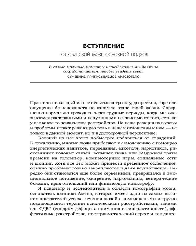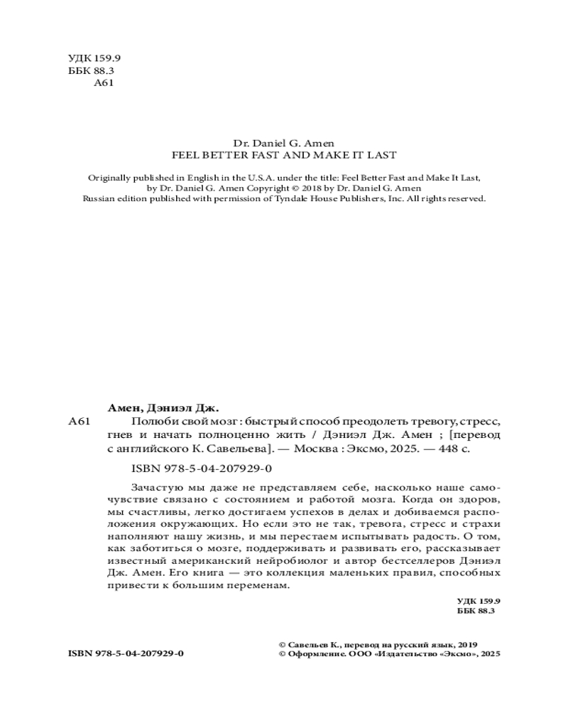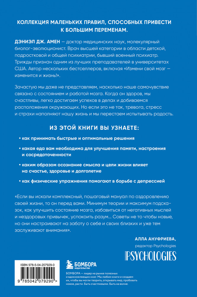 Серия: Психология и мозг по Амену (новое оформление) В счастливом человеке — здоровый мозг! И для известного американского нейробиолога и автора бестселлеров Дэниэла Дж. Амена это давно подтвержденный факт. Его клинический опыт и исследования показывают: наше физиологическое состояние напрямую влияет на эмоции, чувства, мысли и отношения, область психологическую, социальную и духовную. Почувствовать улучшение в каждой из этих сфер можно, если беречь свой мозг и развивать его. О методах, способных помочь решению этих задач, автор увлекательно рассказывает на страницах своей книги. |