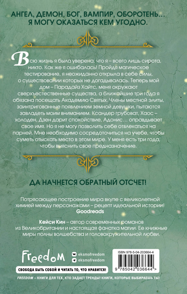 💳 Оплатить за товар можно при получении 🇰🇿 Есть бесплатная доставка по Казахстану от 1 дня 🎁 Копите бонусы с каждой покупки Серия: Freedom. Академия Святых Всю свою жизнь я бродила по улицам родного городка, точно уверенная в том, что я — всего лишь сирота, обычная девушка, никто... Как же я ошибалась! Мой мир изменился в двадцать второй день рождения: пройдя магическое тестирование, я неожиданно открыла в себе силы, о существовании которых и не догадывалась. Теперь мой дом — Парадайз Хайтс, меня окружают сверхъестественные существа, а ближайшие три года я обязана посещать Академию Святых. Члены местной элиты, заинтригованные появлением земной девушки, пытаются завладеть моим вниманием. Ксандер грубоват, Хаос — холоден, Дзен дарит спокойствие, а Адонис... оправдывает свое имя. Но я не могу позволить себе отвлекаться на парней. Мне необходимо сосредоточиться на учебе, чтобы суметь отыскать свое место в этом мире. Ангел, демон, бог, вампир, оборотень... Я могу оказаться кем угодно, и чтобы выяснить свое предназначение, у меня есть три года. Да начнется обратный отсчет! |
