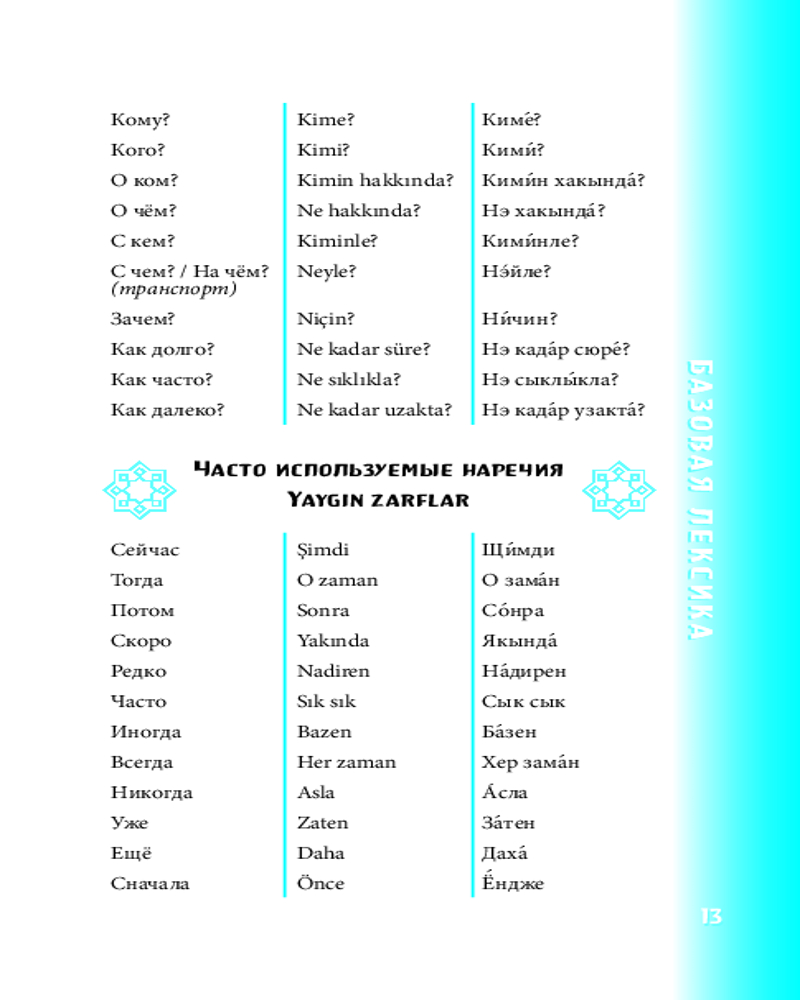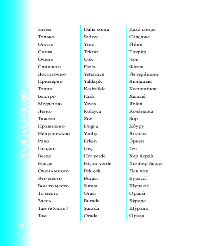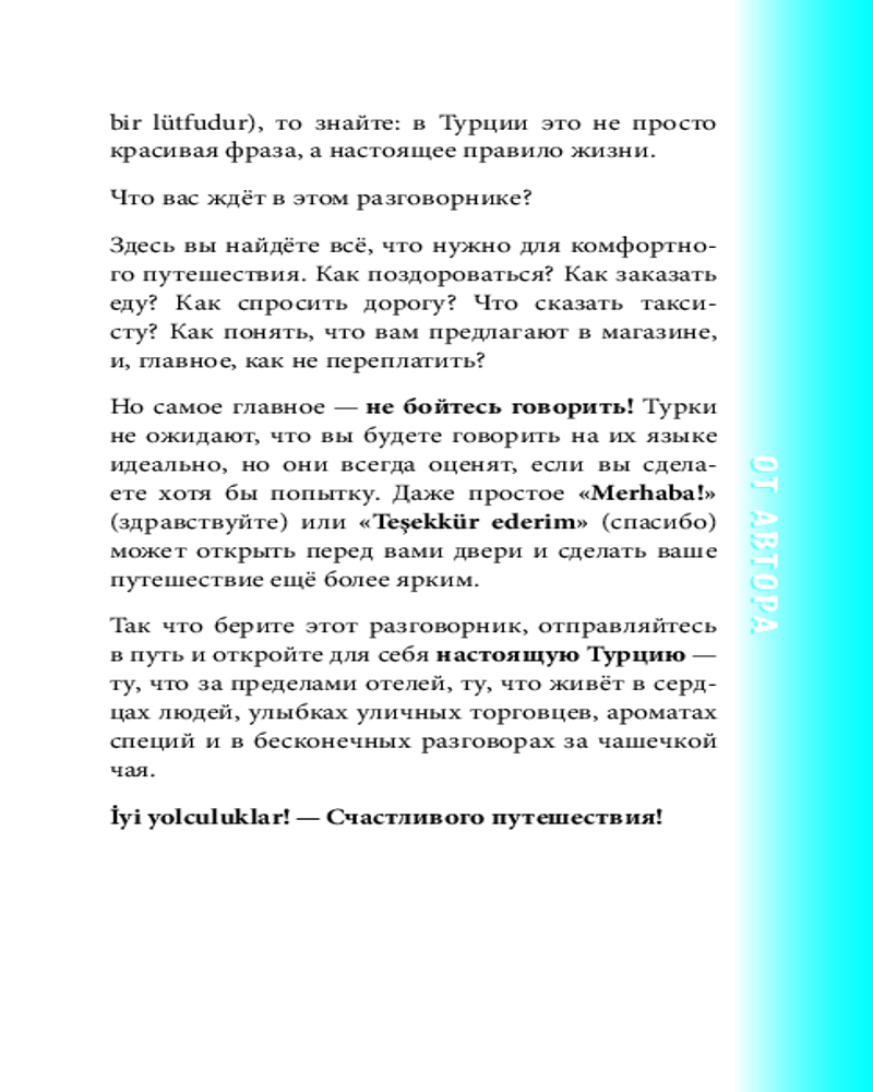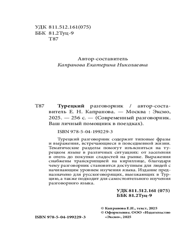💳 Оплатить за товар можно при получении 🇰🇿 Есть бесплатная доставка по Казахстану от 1 дня 🎁 Копите бонусы с каждой покупки Серия: Современный разговорник. Ваш личный помощник в поездках Начни говорить на турецком уже сейчас! Турецкий разговорник поможет изъясниться за границей в различных ситуациях: будь то заказ обеда в ресторане или поход в аптеку. Разговорник включает в себя множество тем и выражений, снабженных транскрипцией на кириллице. |
