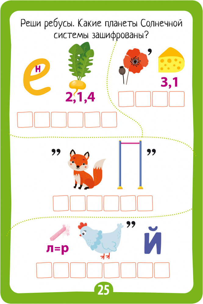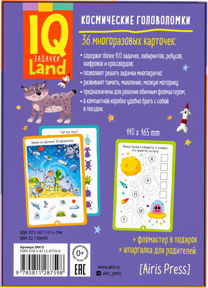 💳 Оплатить за товар можно при получении 🇰🇿 Есть бесплатная доставка по Казахстану от 1 дня 🎁 Копите бонусы с каждой покупки Серия: IQ задачки Приключения в космосе начинаются! В этом наборе карточек ребёнок найдёт множество интересных заданий: лабиринты, ребусы и кроссворды, задания на логику, счёт и внимание, шифровки, рисунки по точкам и по клеточкам. В наборе 36 двухсторонних карточек. Выполняя космические задания и головоломки, ребёнок не только проведёт интересно досуг, но и разовьёт пространственное и логическое мышление, внимание, память. Ответы на самые сложные задания даны в инструкции. |