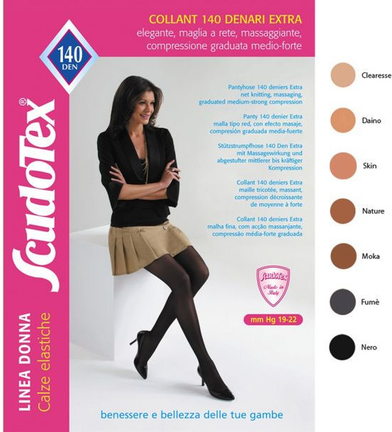 Эластичные колготки Scudotex , изготовленные из очень тонких эластичных нитей, с двойным покрытием и сетчатой или сотовой вязкой, которые, помимо улучшения потоотделения кожи, позволяют за счет поперечной и продольной растяжимости сетки получать эффективную градуированную компрессию, уменьшающуюся снизу вверх.