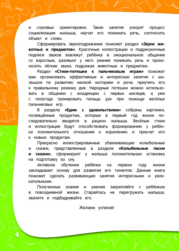Очень хорошая книжка! Занимаемся с удовольствием! Картинки яркие, большие. Дочке 6 месяцев. Занимаемся по минут 7, книгу когда видит радуется. Всем советую! Книга не до года, а скорее всего до двух лет.