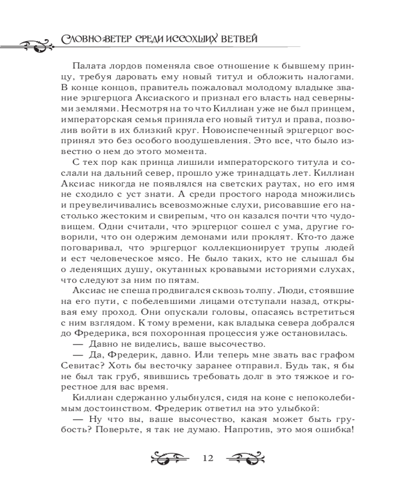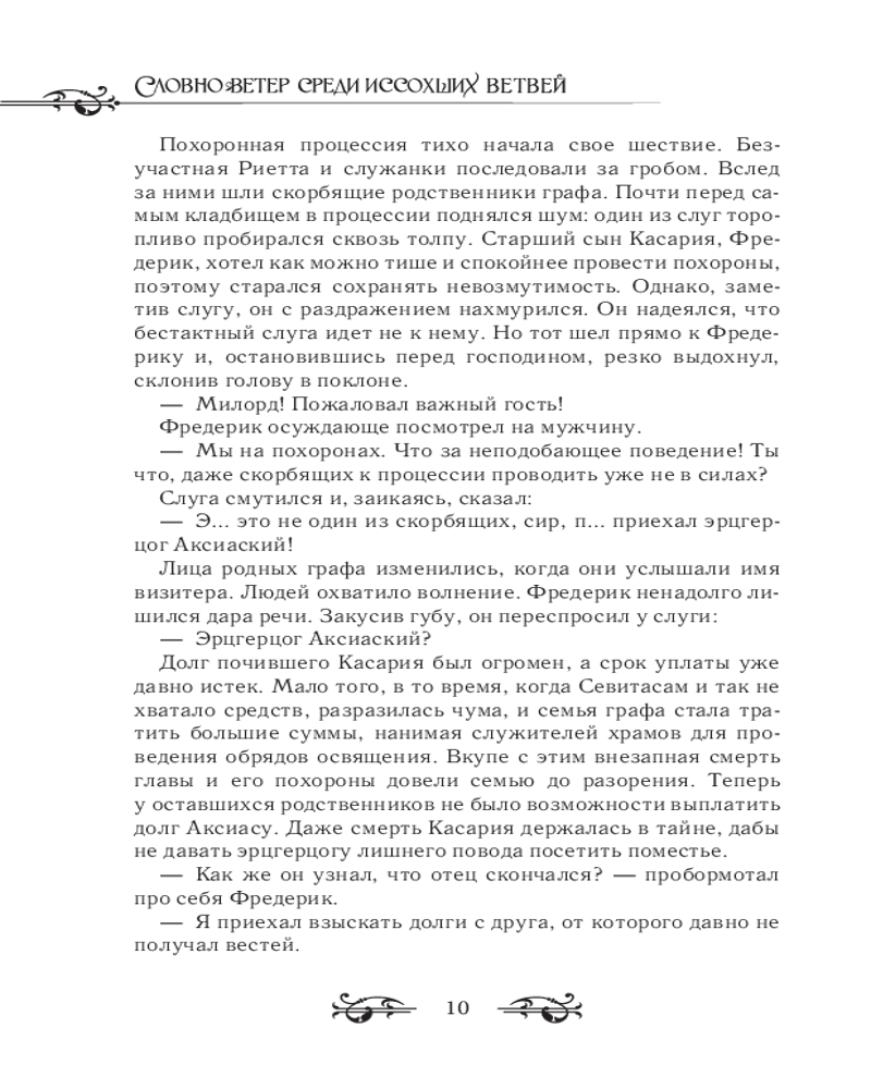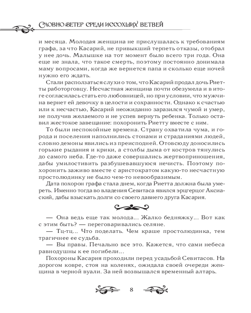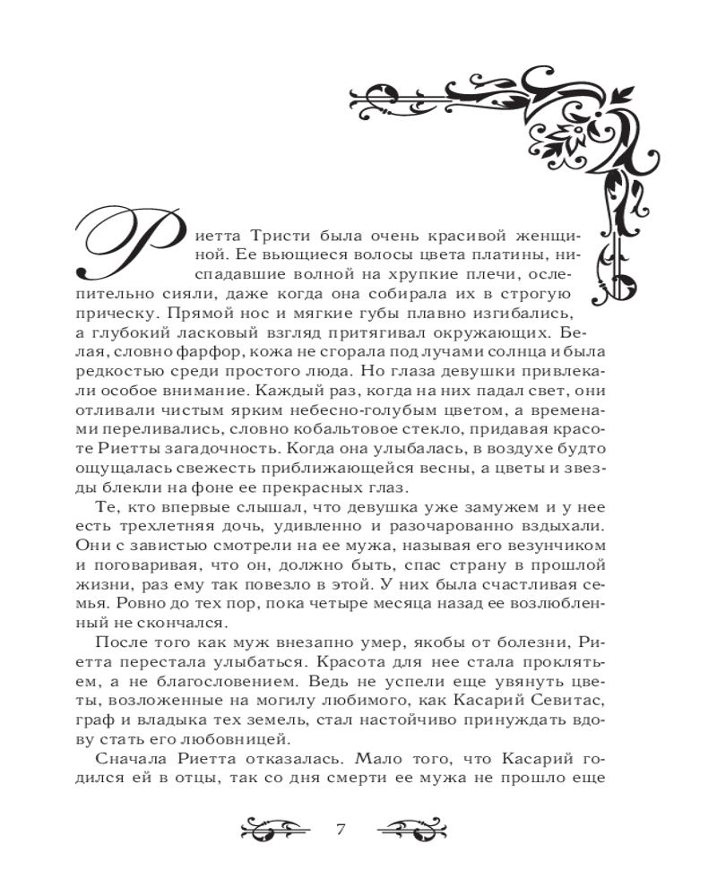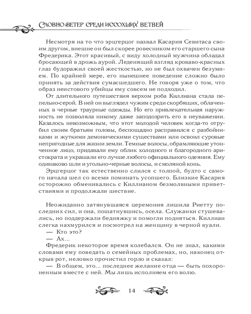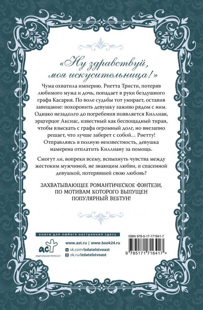 Серия: Новелла. Словно ветер среди иссохших ветвей Чума охватила империю. Риетта Тристи, потеряв любимого мужа и дочь, попадает в руки бездушного графа Касария. По воле судьбы тот умирает, оставив завещание: похоронить девушку заживо рядом с ним. Однако незадолго до погребения появляется Киллиан, эрцгерцог Аксиас, известный как беспощадный тиран, чтобы взыскать с графа огромный долг, но внезапно решает, что лучше заберет с собой... Риетту! Отправляясь в полную неизвестность, девушка намерена отплатить Киллиану за помощь. Смогут ли, вопреки всему, вспыхнуть чувства между жестоким мужчиной, не знающим любви, и спасенной девушкой, потерявшей свою любовь? |
