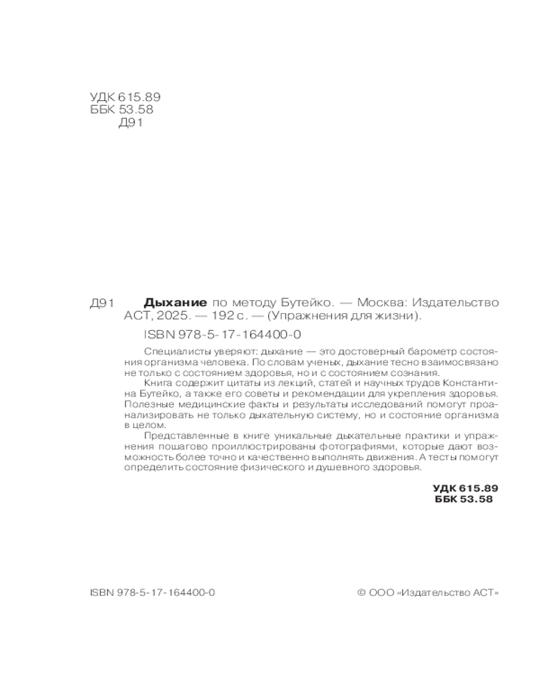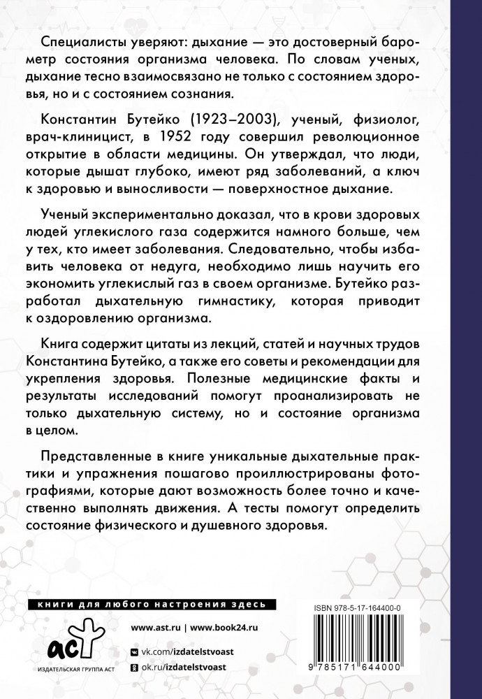 💳 Оплатить за товар можно при получении 🇰🇿 Есть бесплатная доставка по Казахстану от 1 дня 🎁 Копите бонусы с каждой покупки Серия: Упражнения для жизни Специалисты уверяют: дыхание — это достоверный барометр состояния организма человека. По словам ученых, дыхание тесно взаимосвязано не только с состоянием здоровья, но и с состоянием сознания. Константин Бутейко (1923-2003), ученый, физиолог, врач-клиницист, в 1952 году совершил революционное открытие в области медицины. Он утверждал, что люди, которые дышат глубоко, имеют ряд заболеваний, а ключ к здоровью и выносливости — поверхностное дыхание. Ученый экспериментально доказал, что в крови здоровых людей углекислого газа содержится намного больше, чем у тех, кто имеет заболевания. Следовательно, чтобы избавить человека от недуга, необходимо лишь научить его экономить углекислый газ в своем организме. Бутейко разработал дыхательную гимнастику, которая приводит к оздоровлению организма. |