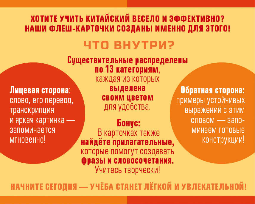 💳 Оплатить за товар можно при получении 🇰🇿 Есть бесплатная доставка по Казахстану от 1 дня 🎁 Копите бонусы с каждой покупки Серия: Флеш-карточки для изучения иностранного языка Хотите учить китайский весело и эффективно? Флеш-карточки созданы именно для этого. На лицевой стороне каждой карточки размещены слово на китайском языке, его перевод, транскрипция пиньинь и яркая картинка для упрощения запоминания. На обратной стороне — примеры употребления слова в контексте. Таким образом вы не только выучите лексику, но и сможете использовать её в речи. Слова разделены на 13 категорий, каждая из которых выделена своим цветом. Набор флеш-карточек подойдёт взрослым и детям, заинтересованным в изучении китайского языка. |