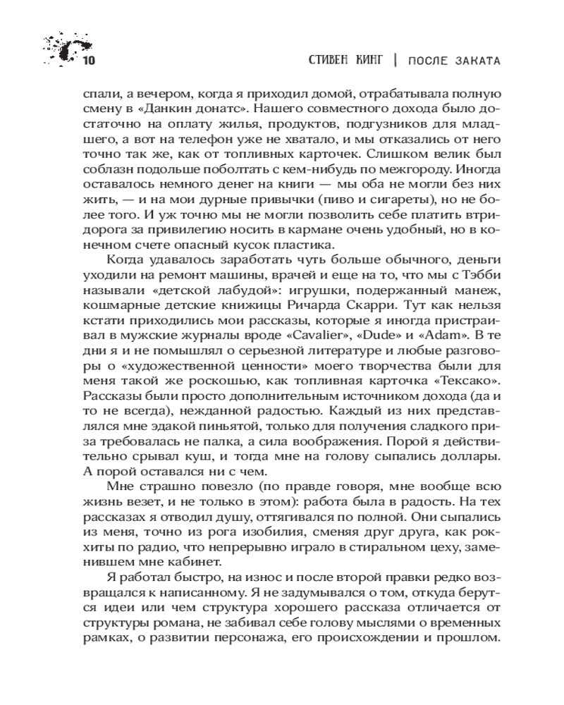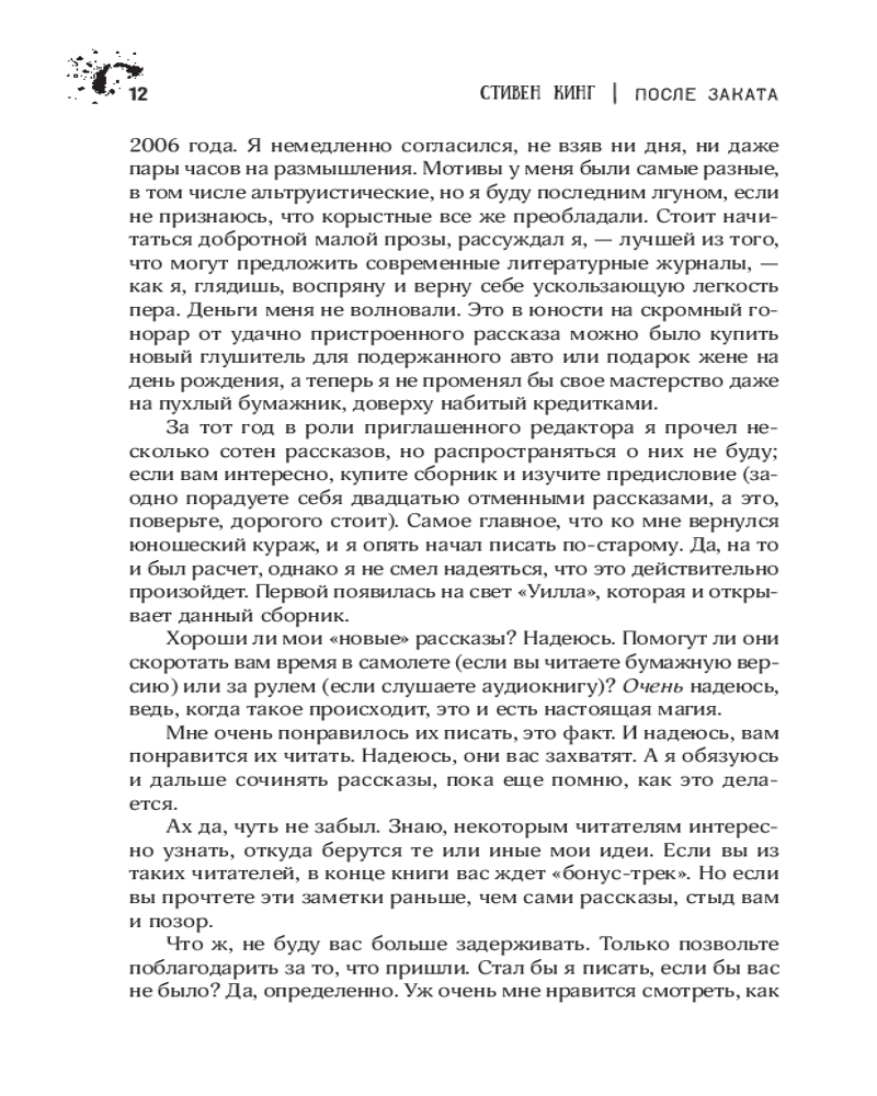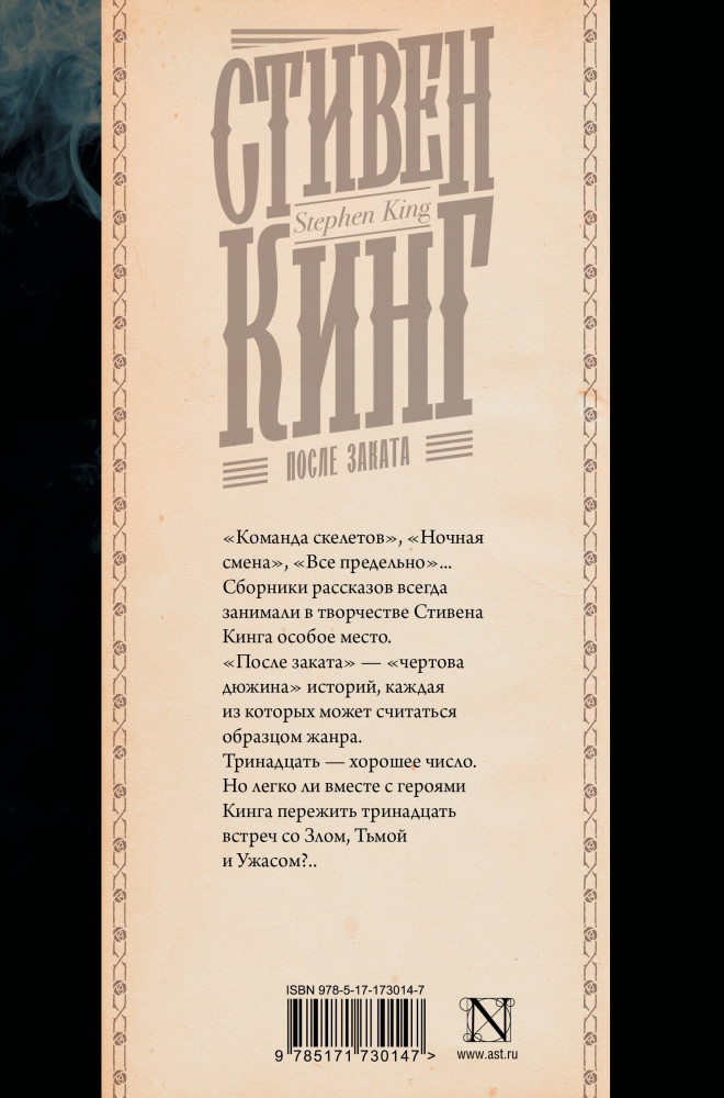 💳 Оплатить за товар можно при получении 🇰🇿 Есть бесплатная доставка по Казахстану 🎁 Копите бонусы с каждой покупки Серия: Кинг: книжная полка «Команда скелетов», «Ночная смена», «Все предельно»... Сборники рассказов всегда занимали в творчестве Стивена Кинга особое место. «После заката» — «чертова дюжина» историй, каждая из которых может считаться образцом жанра. Тринадцать — хорошее число. Но легко ли вместе с героями Кинга пережить тринадцать встреч со Злом, Тьмой и Ужасом?.. |