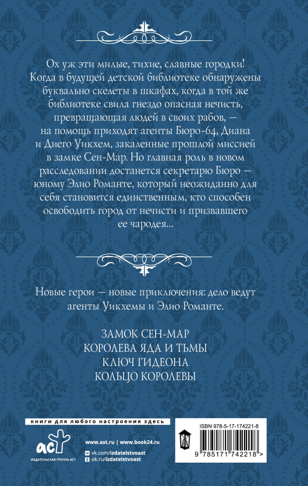 💳 Оплатить за товар можно при получении 🇰🇿 Есть бесплатная доставка по Казахстану от 1 дня 🎁 Копите бонусы с каждой покупки Серия: Магия викторианского детектива Ох уж эти милые, тихие, славные городки! Когда в будущей детской библиотеке обнаружены буквально скелеты в шкафах, когда в той же библиотеке свила гнездо опасная нечисть, превращающая людей в своих рабов — на помощь приходят агенты Бюро-64, Диана и Диего Уикхемы, закаленные прошлой миссией в замке Сен-Мар. Но главная роль в новом расследовании достанется секретарю Бюро — юному Элио Романте, который неожиданно для себя становится единственным, кто способен освободить город от нечисти и призвавшего ее чародея... |