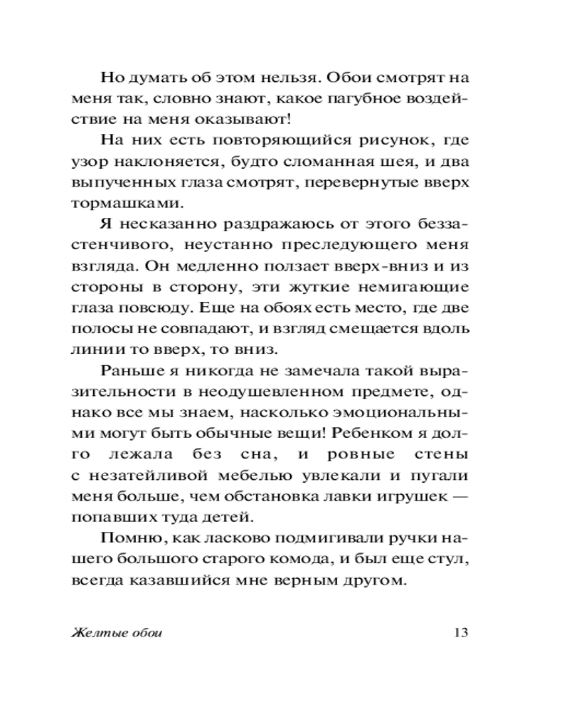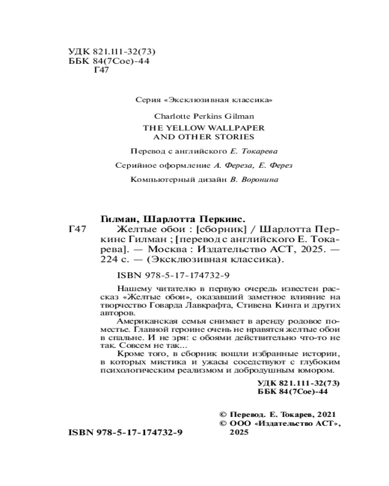 💳 Оплатить за товар можно при получении 🇰🇿 Есть бесплатная доставка по Казахстану от 1 дня 🎁 Копите бонусы с каждой покупки Серия: Эксклюзивная классика Нашему читателю в первую очередь известен рассказ «Желтые обои», оказавший заметное влияние на творчество Говарда Лавкрафта, Стивена Кинга и других авторов. Американская семья снимает в аренду родовое поместье. Главной героине очень не нравятся желтые обои в спальне. И не зря: с обоями действительно что-то не так. Совсем не так... Кроме того, в сборник вошли избранные истории, в которых мистика и ужасы соседствуют с глубоким психологическим реализмом и добродушным юмором. |