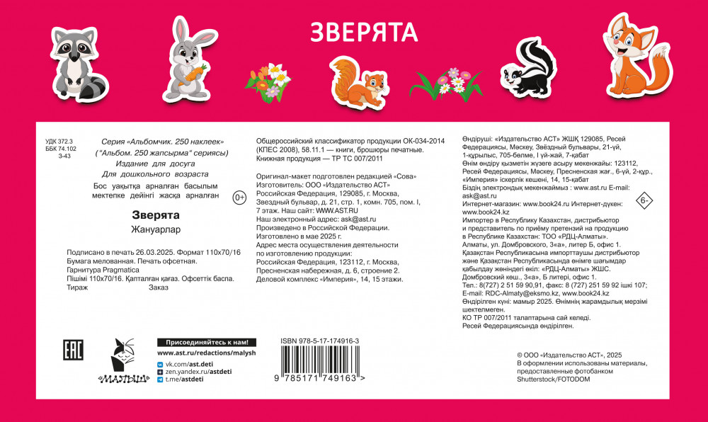 💳 Оплатить за товар можно при получении 🇰🇿 Есть бесплатная доставка по Казахстану от 1 дня 🎁 Копите бонусы с каждой покупки Серия: 250 наклеек. Альбом «Зверята» — это более 250 стикеров и 6 страниц цветных фонов для безграничной детской фантазии. Играя с книжкой, дошколята познакомятся с миром живой природы, запомнят названия лесных животных. Весёлые уроки окружающего мира развивают воображение, память и внимание, способствуют развитию речи, зрительного восприятия и мелкой моторики. Книга с мелованными страницами отличного качества — поэтому стикеры можно наклеивать много раз! Для дошкольного возраста. |
